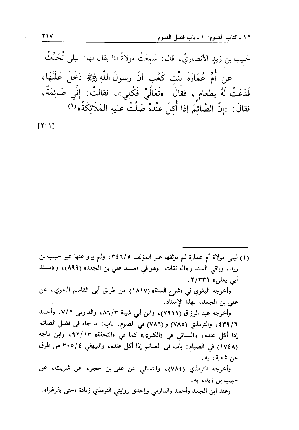 عَنْ أُمِّ عُمَارَةَ بِنْتِ كَعْبٍ أَنَّ رَسُولَ اللَّهِ صَلَّى اللَّهُ عَلَيْهِ وَسَلَّمَ دَخَلَ عَلَيْهَا، فَدَعَتْ لَهُ بِطَعَامٍ، فَقَالَ: "تَعَالَيْ فَكُلِي"، فَقَالَتْ: إِنِّي صَائِمَةٌ، فَقَالَ: "إِنَّ الصَّائِمَ إِذَا أُكِلَ عِنْدَهُ صَلَّتْ عليه الملائكة" (1) .