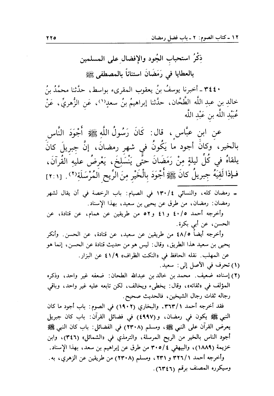 3440 - أَخْبَرَنَا يُوسُفُ بْنُ يَعْقُوبَ الْمُقْرِئُ بِوَاسِطَ، حَدَّثَنَا مُحَمَّدُ بْنُ خَالِدِ بْنِ عَبْدِ اللَّهِ الطَّحَّانُ، حَدَّثَنَا إِبْرَاهِيمُ بْنُ سَعْدٍ (1) ، عَنِ الزُّهْرِيِّ، عَنْ عُبَيْدِ اللَّهِ بْنِ عَبْدِ اللَّهِ