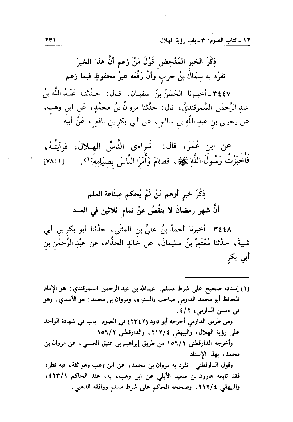 وقول الدارقطني: تفرد به مروان بن محمد، عن ابن وهب وهو ثقة، فيه نظر، والبيهقي 4/212. وصحَّحه الحاكم على شرطِ مُسلمٍ ووافقه الذهبي.