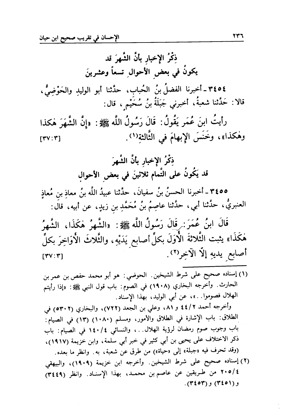 (1) إسناده صحيح على شرط الشيخين. الحوضي: هو أبو محمد حفص بن عمر بن الحارث. وأخرجه البخاري "1908" في الصوم: باب قول النبي صلى الله عليه وسلم: "إذا رأيتم الهلال فصوموا.."، عن أبي الوليد، بهذا الإسناد.