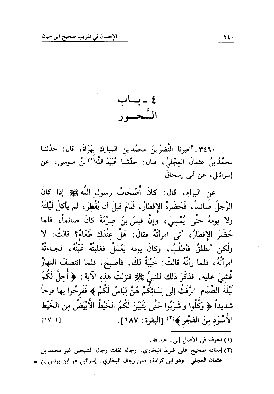 عَنِ الْبَرَاءِ، قَالَ: كَانَ أَصْحَابِ رَسُولِ اللَّهِ صَلَّى اللَّهُ عَلَيْهِ وَسَلَّمَ إِذَا كَانَ الرَّجُلُ صَائِمًا، فَحَضَرَهُ الْإِفْطَارُ، فَنَامَ قَبْلَ أَنْ يُفْطِرَ، لَمْ يَأْكُلْ لَيْلَتَهُ وَلَا يَوْمَهُ حَتَّى يُمْسِيَ، وَإِنَّ قَيْسَ بْنَ صِرْمَةَ كَانَ صَائِمًا، فَلَمَّا حَضَرَ الْإِفْطَارُ، أَتَى امْرَأَتَهُ فَقَالَ: هَلْ عِنْدَكِ طَعَامٌ؟ قَالَتْ: لَا وَلَكِنْ أَنْطَلِقُ فَأَطْلُبُ، وَكَانَ يَوْمَهُ يَعْمَلُ فَغَلَبَتْهُ عَيْنُهُ، فَجَاءَتْهُ امْرَأَتُهُ، فَلَمَّا رَأَتْهُ قَالَتْ: خيبة لك، فأصبح، فلما انتصف النهار غشي عَلَيْهِ، فَذُكِرَ ذَلِكَ لِلنَّبِيِّ صَلَّى اللَّهُ عَلَيْهِ وَسَلَّمَ فَنَزَلَتْ هَذِهِ الْآيَةُ: {أُحِلَّ لَكُمْ لَيْلَةَ الصِّيَامِ الرَّفَثُ إِلَى نِسَائِكُمْ هُنَّ لِبَاسٌ لَكُمْ وَأَنْتُمْ لِبَاسٌ لَهُنَّ} (البقرة: من الآية187) ، فَفَرِحُوا بِهَا فَرَحًا شَدِيدًا {وَكُلُوا وَاشْرَبُوا حَتَّى يَتَبَيَّنَ لَكُمُ الْخَيْطُ الْأَبْيَضُ مِنَ الْخَيْطِ الْأَسْوَدِ مِنَ الْفَجْرِ} (البقرة: 187) (2)