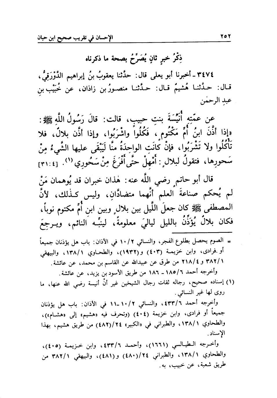 قَالَ أَبُو حَاتِمٍ رَضِيَ الله تعالى عَنْهُ: هَذَانِ خَبَرَانِ قَدْ يُوهِمَانِ مَنْ لَمْ يُحْكِمْ صِنَاعَةَ الْعِلْمِ أَنَّهُمَا مُتَضَادَّانِ، وَلَيْسَ كَذَلِكَ، لِأَنَّ الْمُصْطَفَى صَلَّى اللَّهُ عَلَيْهِ وَسَلَّمَ كَانَ جَعَلَ اللَّيْلَ بَيْنَ بِلَالٍ وَبَيْنَ ابْنِ أُمِّ مَكْتُومٍ نَوْبًا، فَكَانَ بِلَالٌ يُؤَذِّنُ بِاللَّيْلِ لَيَالِيَ معلومة، لينبه النائم، ويرجع
