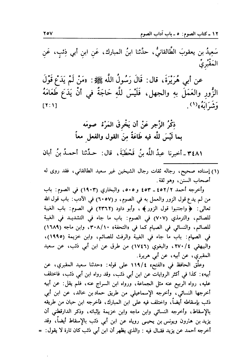 عَنْ أَبِي هُرَيْرَةَ، قَالَ: قَالَ رَسُولُ اللَّهِ صَلَّى اللَّهُ عَلَيْهِ وَسَلَّمَ: "مَنْ لَمْ يَدَعْ قَوْلَ الزُّورِ وَالْعَمَلَ بِهِ وَالْجَهْلَ، فَلَيْسَ لِلَّهِ حَاجَةٌ فِي أَنْ يدع طعامه وشرابه" (1) .