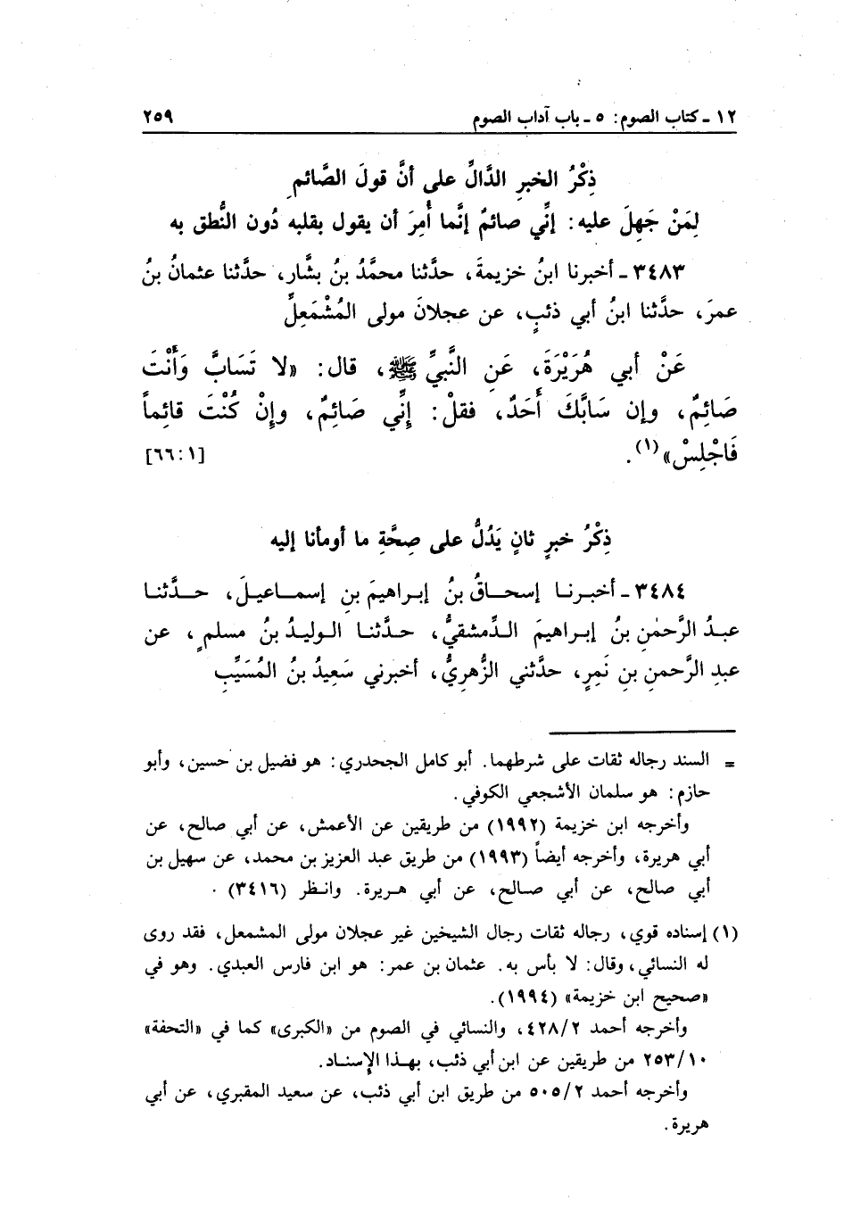 عَنْ أَبِي هُرَيْرَةَ، عَنِ النَّبِيِّ صَلَّى اللَّهُ عَلَيْهِ وَسَلَّمَ، قَالَ: "لَا تَسَابَّ وَأَنْتَ صَائِمٌ، وَإِنْ سَابَّكَ أَحَدٌ، فَقُلْ: إِنِّي صَائِمٌ، وَإِنْ كُنْتَ قَائِمًا فَاجْلِسْ" (1)