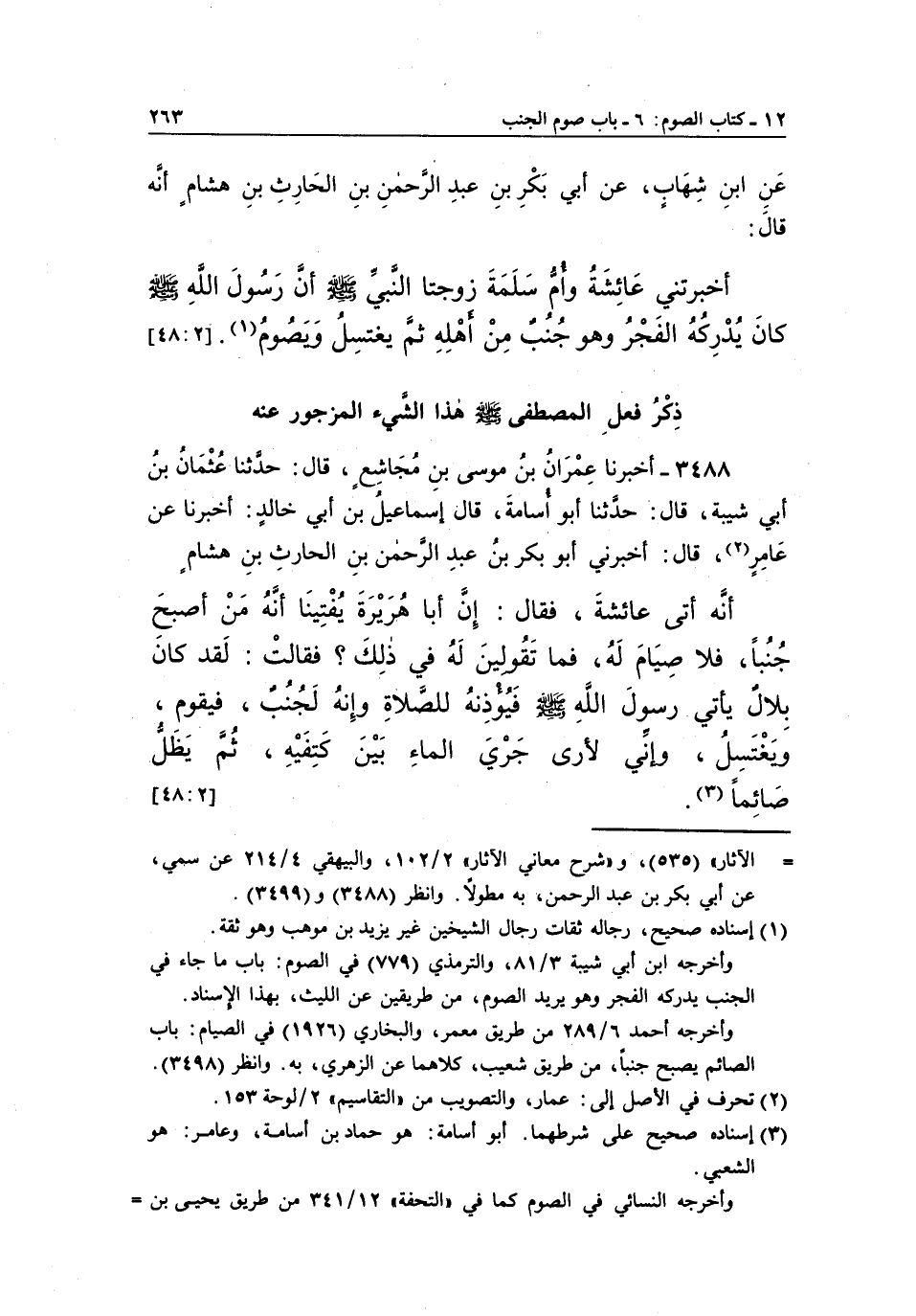 3488 - أَخْبَرَنَا عِمْرَانُ بْنُ مُوسَى بْنِ مُجَاشِعٍ، قَالَ: حَدَّثَنَا عُثْمَانُ بْنُ أَبِي شَيْبَةَ، قَالَ: حَدَّثَنَا أَبُو أُسَامَةَ، قَالَ إِسْمَاعِيلُ بْنُ أَبِي خَالِدٍ: أُخْبِرْنَا عَنْ عَامِرٍ (1) ، قَالَ: أَخْبَرَنِي أَبُو بَكْرِ بْنُ عَبْدِ الرَّحْمَنِ بْنِ الْحَارِثِ بْنِ هِشَامٍ