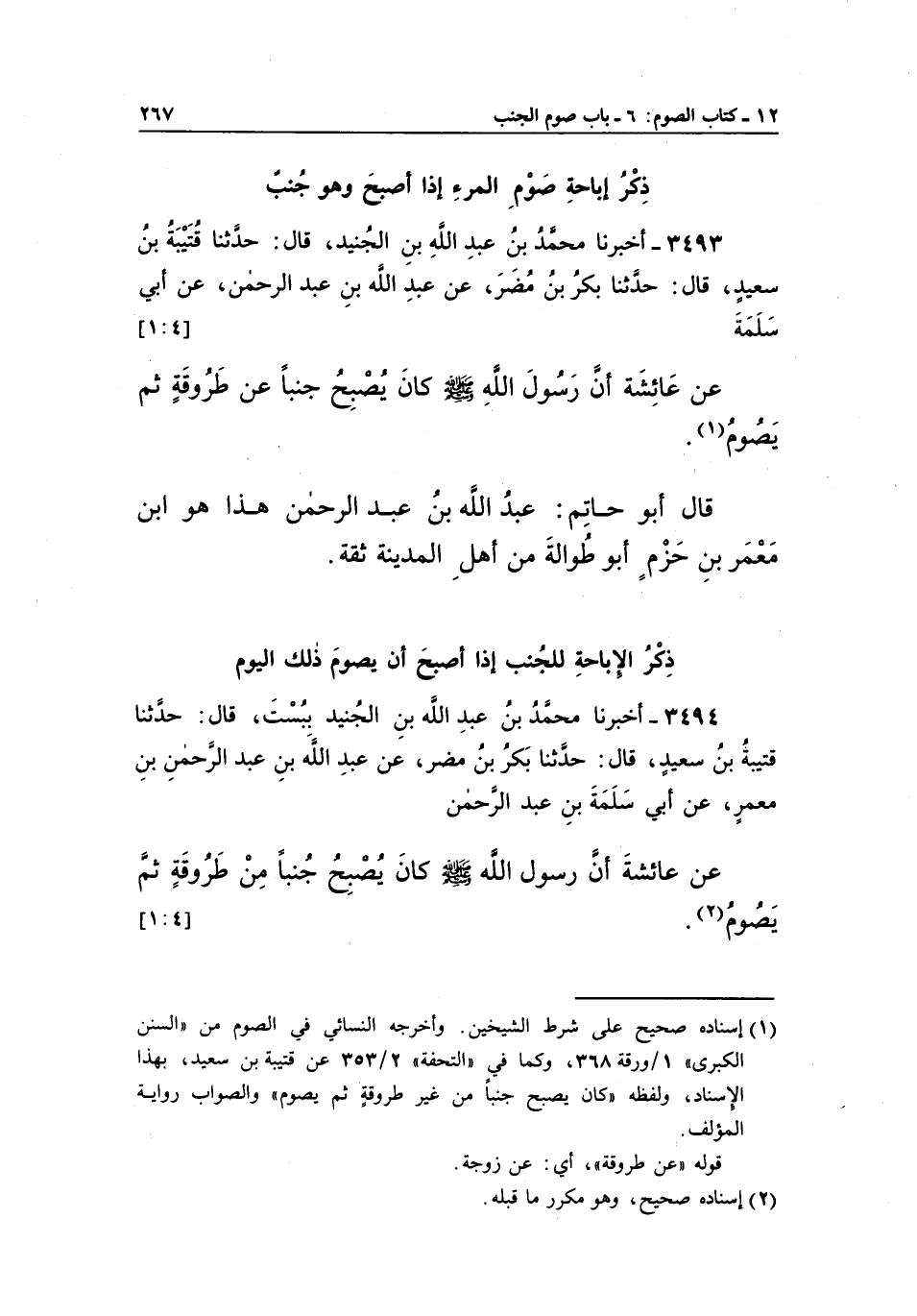 (1) إسناده صحيح على شرط الشيخين. وأخرجه النسائي في الصوم من "السنن الكبرى" 1/ ورقة 368، وكما قي "التحفة" 2/353 عن قتيبة بن سعيد، بهذا الإسناد، ولفظه "كان يصبح جنباً من غير طروقة ثم يصوم" والصواب رواية المؤلف.