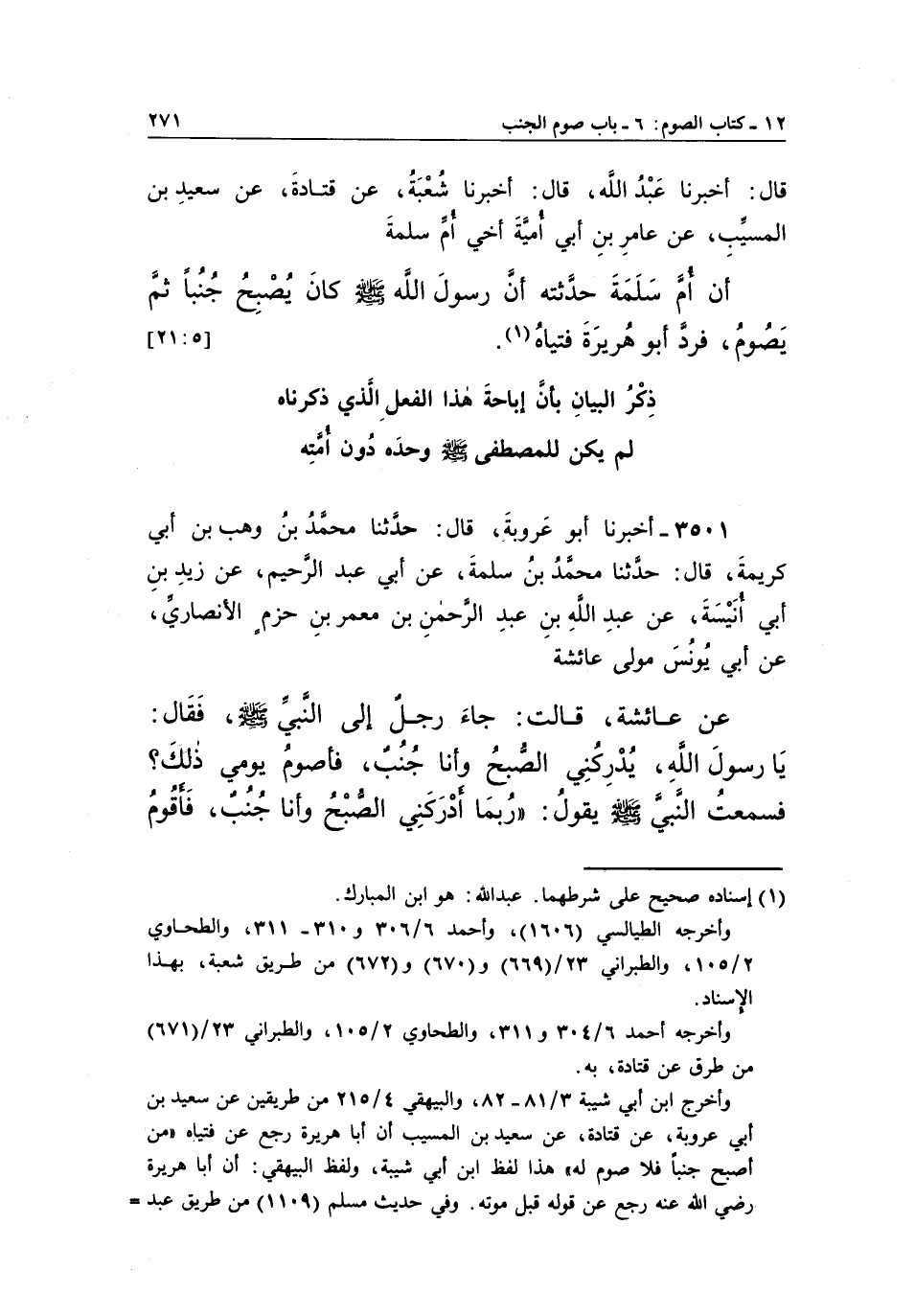 عَنْ عَائِشَةَ، قَالَتْ: جَاءَ رَجُلٌ إِلَى النَّبِيِّ صَلَّى اللَّهُ عَلَيْهِ وَسَلَّمَ، فَقَالَ: يَا رَسُولَ اللَّهِ، يُدْرِكُنِي الصُّبْحُ وَأَنَا جُنُبٌ، فَأَصُومُ يَوْمِي ذَلِكَ؟ فَسَمِعْتُ النَّبِيَّ صَلَّى الله عليه وسلم يقول: "ربما أدركني الصبح وأنا جنب، فأقومذكر الْبَيَانِ بِأَنَّ إِبَاحَةَ هَذَا الْفِعْلِ الَّذِي ذَكَرْنَاهُ لَمْ يَكُنْ لِلْمُصْطَفَى صَلَّى اللَّهُ عَلَيْهِ وَسَلَّمَ وَحْدَهُ دُونَ أُمَّتِهِ