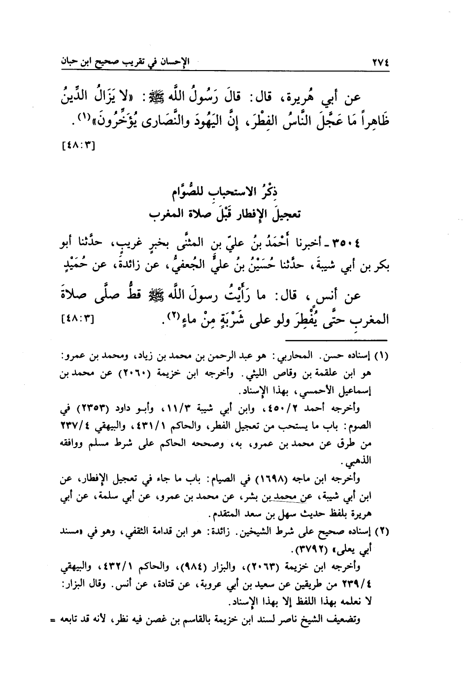 عَنْ أَبِي هُرَيْرَةَ، قَالَ: قَالَ رَسُولُ اللَّهِ صَلَّى اللَّهُ عَلَيْهِ وَسَلَّمَ: "لَا يَزَالُ الدِّينُ ظَاهِرًا مَا عَجَّلَ النَّاسُ الْفِطْرَ، إِنَّ الْيَهُودَ والنصارى يؤخرون" (1) .