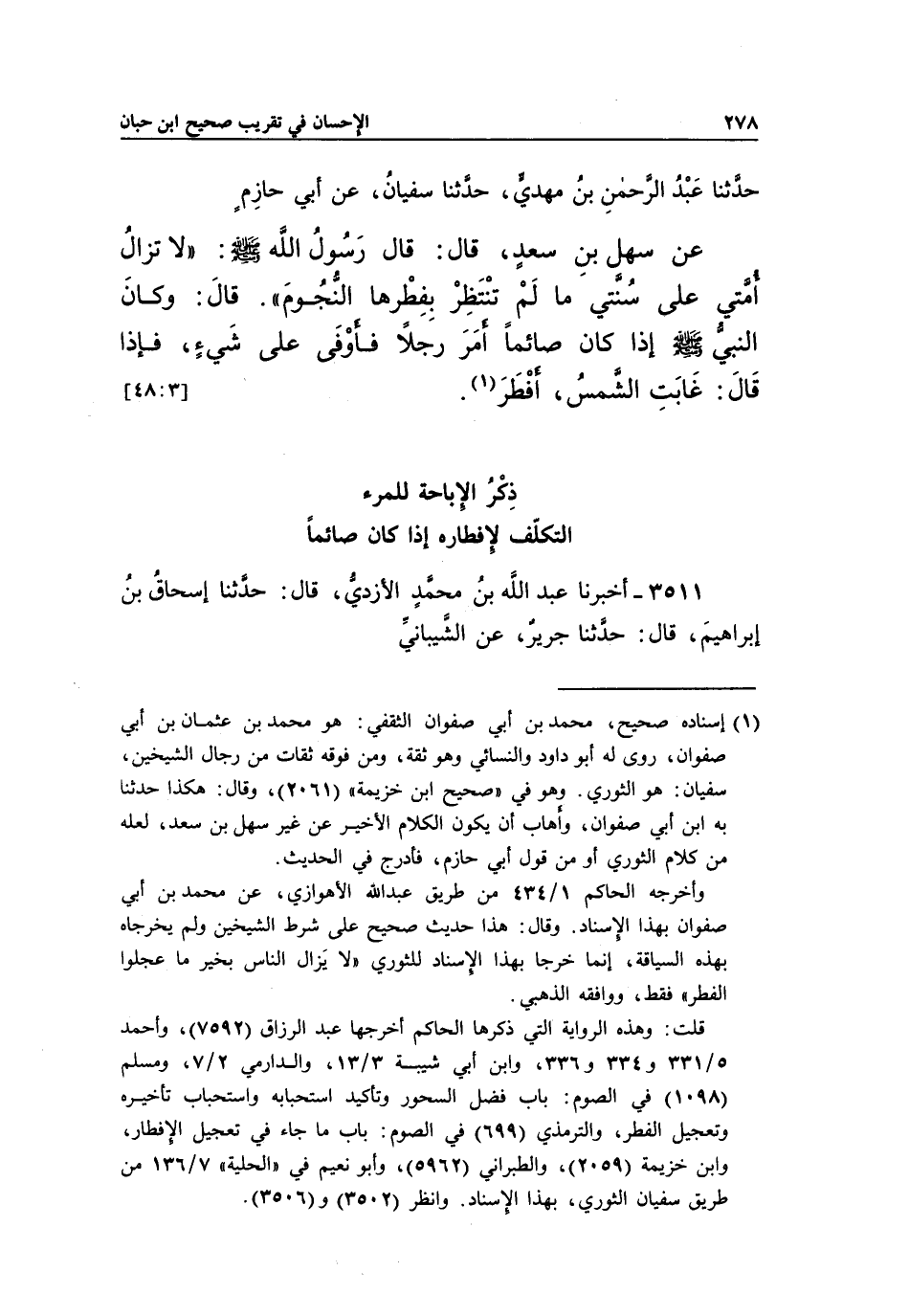 3511 - أَخْبَرَنَا عَبْدُ اللَّهِ بْنُ مُحَمَّدٍ الْأَزْدِيُّ، قَالَ: حَدَّثَنَا إِسْحَاقُ بْنُ إِبْرَاهِيمَ، قَالَ: حَدَّثَنَا جَرِيرٌ، عن الشيبانيذكر الْإِبَاحَةِ لِلْمَرْءِ التَّكَلُّفَ لِإِفْطَارِهِ إِذَا كَانَ صَائِمًا
