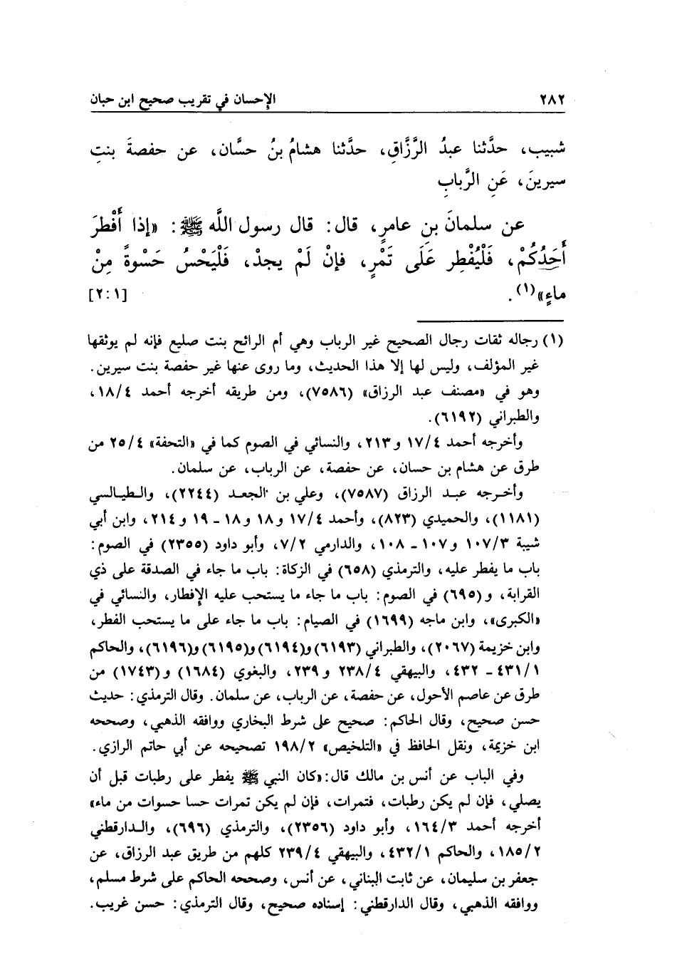 وأخرجه عبد الرزاق "7587"، وعلي بن الجعد "2244"، والطيالسي "1181"، والحميدي "823"، وأحممد 4/17و 18و 18-19و 214، وابن أبي شيبة 3/107-108، والدارمي 2/7، وأبو داود "2355" في الصوم: باب ما يفطر عليه، والترمذي "658" في الزكاة: باب ما جاء في الصدقة على ذي القرابة، و "695" في الصوم: باب ما جاء ما يستحب عليه الإفطار، والنسائي في "الكبرى"، وابن ماجه "1699" في الصيام: باب ما جاء على ما يستحب الفطر، وابن خزيمة "2067"، والطبراني "6193" و "6194"و "6195" و"6196"، والحاكم 1/431-432، والبيهقي 4/238 و239، والبغوي "1684" و"1743" من طرق عن عاصم الأحول، عن حفصة، عن الرباب، عن سلمان. قال الترمذي: حديث حسن صحيح، وقال الحاكم: صحيح على شرط البخاري ووافقه الذهبي، وصححه ابن خزيمة، ونقل الحافظ في "التلخيص" 2/198 تصحيحه عن ابن أبي حاتم الرازي.
