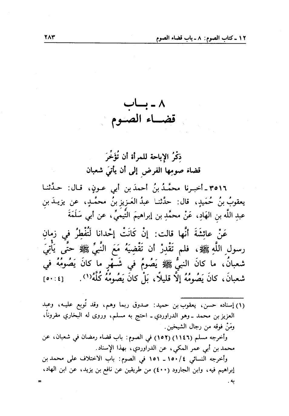 وأخرجه مسلم "1146" "152" في الصوم: باب قضاء رمضان في شعبان، عن محمد بن أبي عمر المكي، عن الدراوردي، بهذا الإسناد.