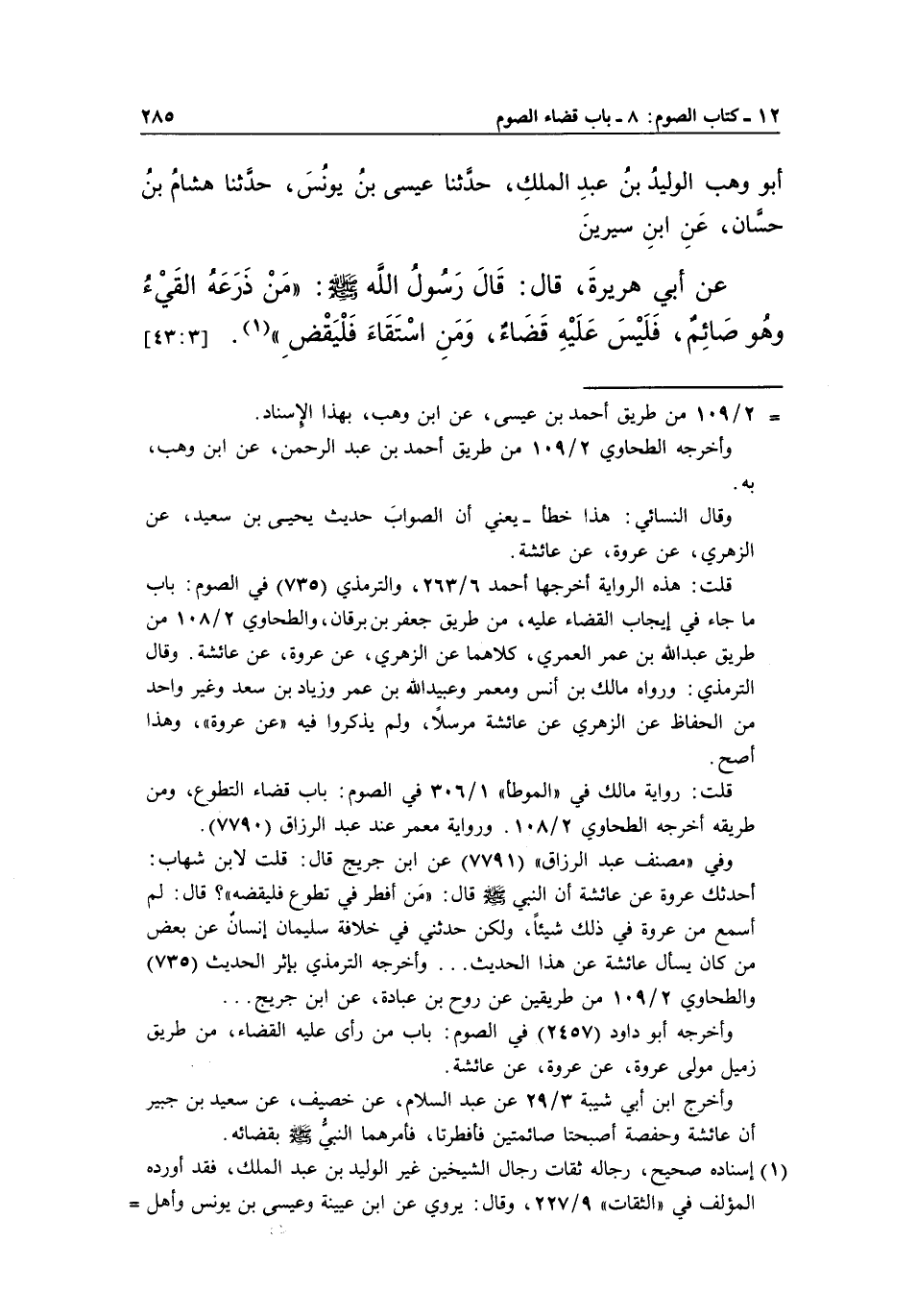 وأخرجه أحمد 2/498، والدارمي 2/14، والبخاري في "التاريخ الكبير" 1/91-92 وأبو داود "2380" في الصوم: باب الصائم يستقيء عامداً، والترمذي "720" في الصوم: باب ما جاء فيمن استقاء عمداً، والنسائي في "الكبرى" كما في "التحفة" 10/354، وابن ماجه "1676"، في الصيام: باب ما جاء في الصائم يقيء وابن خزيمة "1960" و"1961"، والطحاوي 2/97، والدارقطني 2/184، والحاكم 1/426- 427، البيهقي 4/219، والبغوي "1755" من طرق عن عيسى بن يونس، بهذا الإسناد. وصححه الحاكم على شرطهما ووافقه الذهبي، وهو كما قالا.