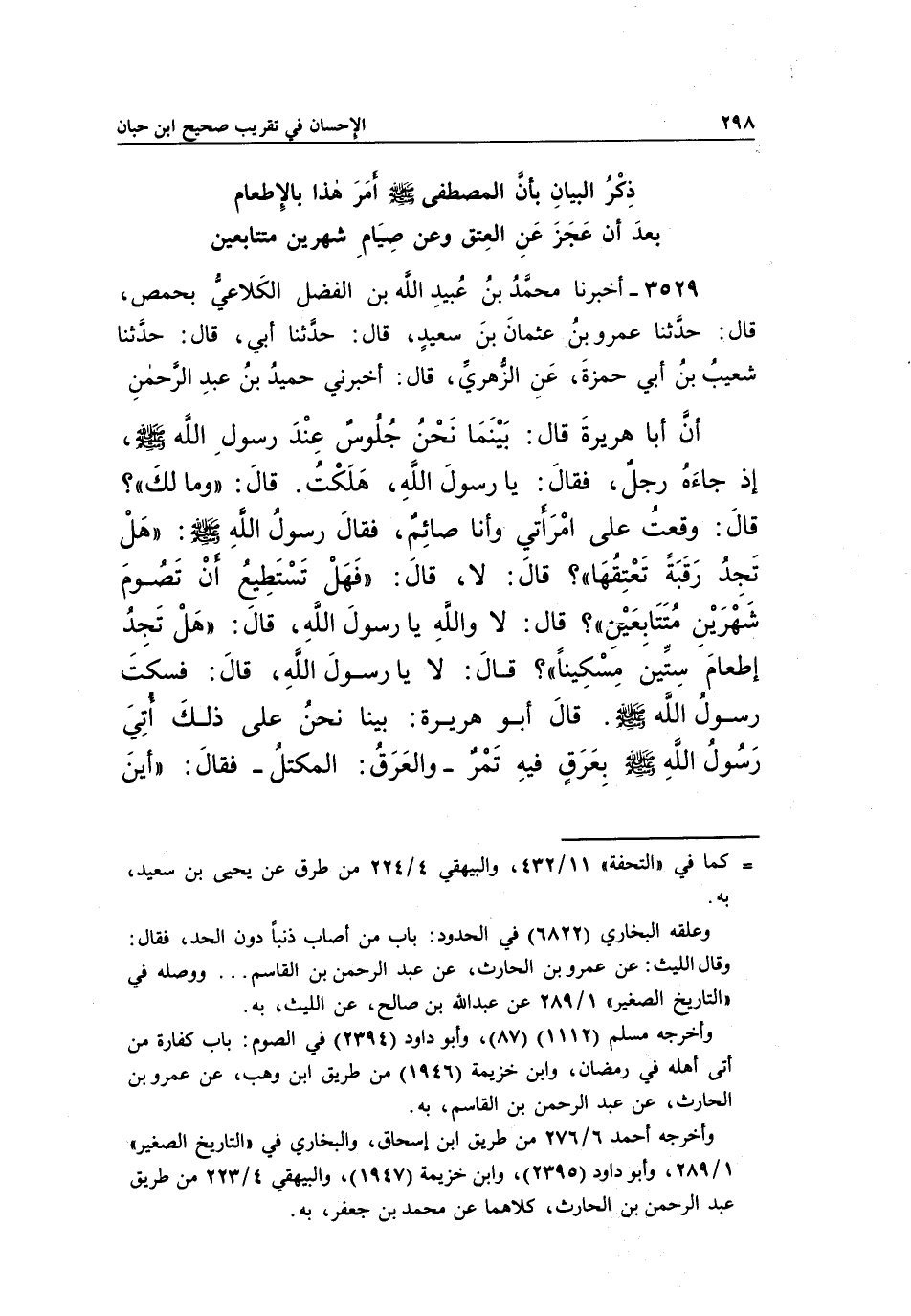 أَنَّ أَبَا هُرَيْرَةَ قَالَ: بَيْنَمَا نَحْنُ جُلُوسٌ عِنْدَ رَسُولِ اللَّهِ صَلَّى اللَّهُ عَلَيْهِ وَسَلَّمَ، إِذْ جَاءَهُ رَجُلٌ، فَقَالَ: يَا رَسُولَ اللَّهِ، هَلَكَتُ. قَالَ: "وَمَا لَكَ"؟ قَالَ: وَقَعْتُ عَلَى امْرَأَتِي وَأَنَا صَائِمٌ، فَقَالَ رَسُولُ اللَّهِ صَلَّى اللَّهُ عَلَيْهِ وَسَلَّمَ: "هَلْ تَجِدُ رَقَبَةً تُعْتِقُهَا"؟ قَالَ: لَا، قَالَ: "فَهَلْ تَسْتَطِيعُ أَنْ تَصُومَ شَهْرَيْنِ مُتَتَابِعَيْنِ"؟ قَالَ: لَا وَاللَّهِ يَا رَسُولَ اللَّهِ، قَالَ: "هَلْ تَجِدُ إِطْعَامَ سِتِّينَ مِسْكِينًا"؟ قَالَ: لَا يَا رَسُولَ اللَّهِ، قَالَ: فَسَكَتَ رَسُولُ اللَّهِ صَلَّى اللَّهُ عَلَيْهِ وَسَلَّمَ. قَالَ أَبُو هُرَيْرَةَ: بَيْنَا نَحْنُ عَلَى ذَلِكَ أَتَى رَسُولَ اللَّهِ صَلَّى اللَّهُ عَلَيْهِ وَسَلَّمَ بِعَرَقٍ فِيهِ تَمْرٌ –وَالْعَرَقُ: المكتل- فقال: "أينذكر الْبَيَانِ بِأَنَّ الْمُصْطَفَى صَلَّى اللَّهُ عَلَيْهِ وَسَلَّمَ أَمَرَ هَذَا بِالْإِطْعَامِ بَعْدَ أَنْ عَجَزَ عَنِ الْعِتْقِ وَعَنْ صِيَامِ شَهْرَيْنِ مُتَتَابِعَيْنِ