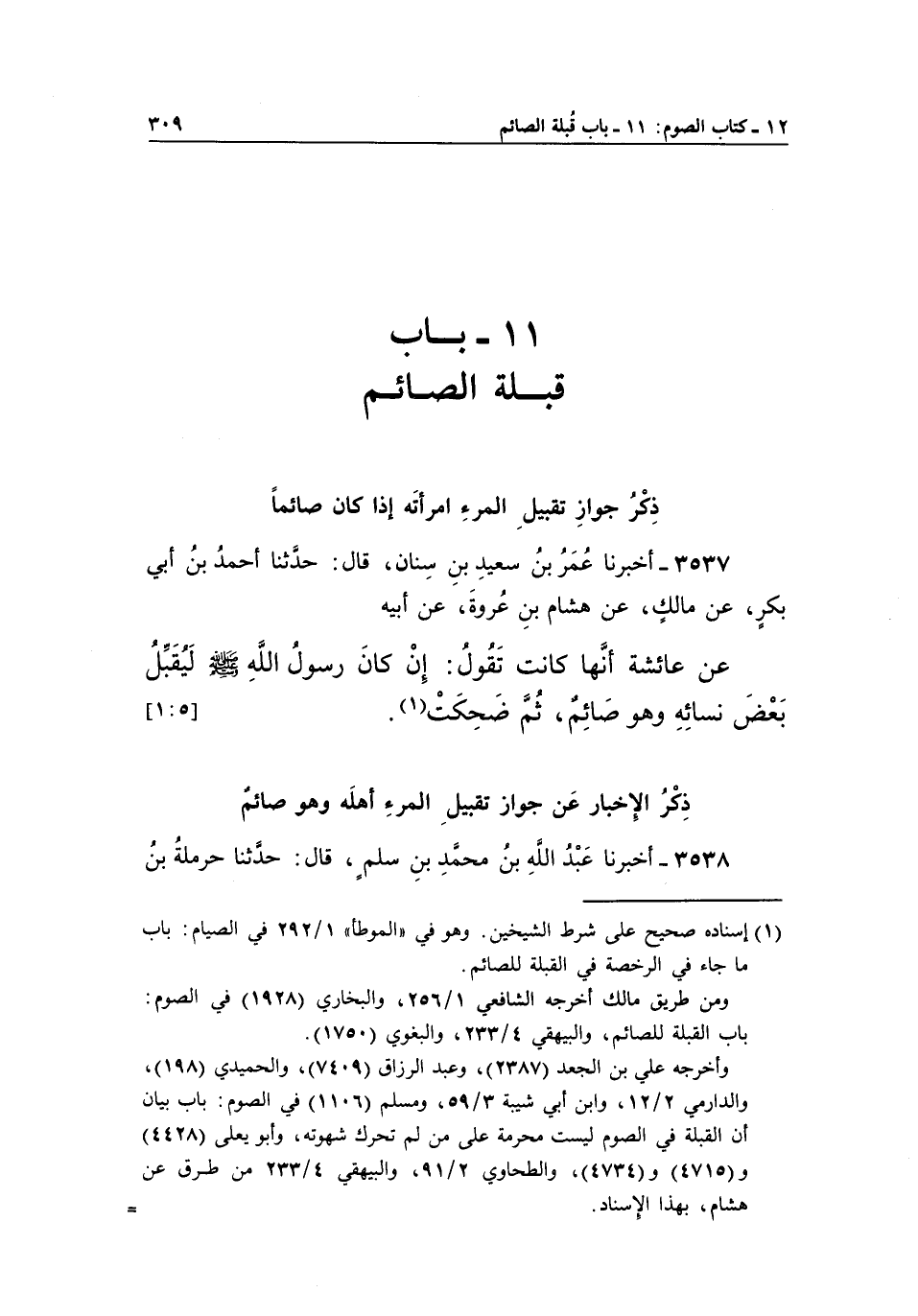3537 - أَخْبَرَنَا عُمَرُ بْنُ سَعِيدِ بْنِ سِنَانٍ، قَالَ: حَدَّثَنَا أَحْمَدُ بْنُ أَبِي بَكْرٍ، عَنْ مَالِكٍ، عَنْ هِشَامِ بْنِ عُرْوَةَ، عَنْ أَبِيهِ عَنْ عَائِشَةَ أَنَّهَا كَانَتْ تَقُولُ: إِنْ كَانَ رَسُولُ اللَّهِ صَلَّى اللَّهُ عَلَيْهِ وَسَلَّمَ لَيُقَبِّلُ بَعْضَ نِسَائِهِ وَهُوَ صَائِمٌ، ثم ضحكت (1) .