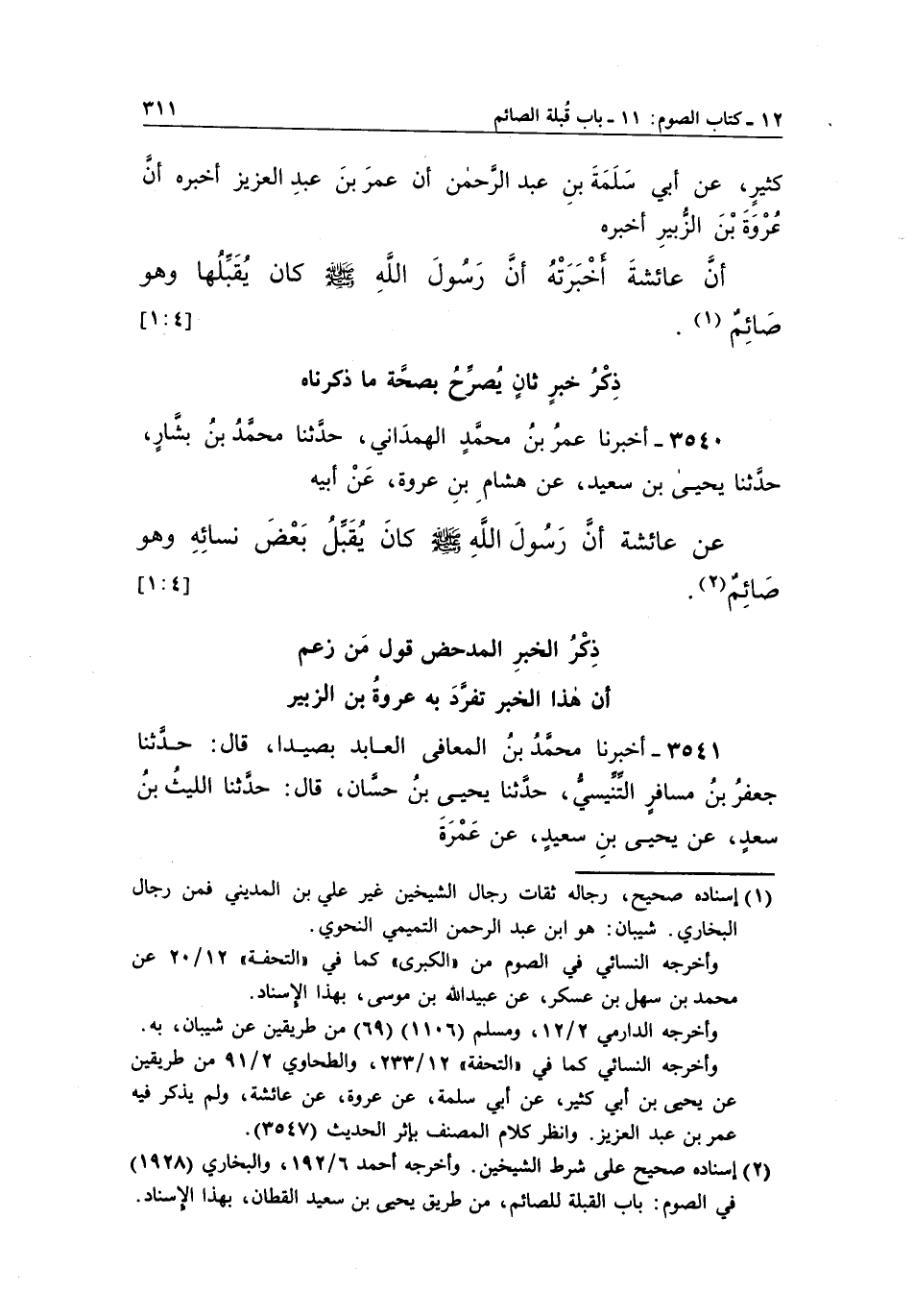 أَنَّ عَائِشَةَ أَخْبَرَتْهُ أَنَّ رَسُولَ اللَّهِ صَلَّى اللَّهُ عَلَيْهِ وسلم كان يقبلها وهو صائم (1) .