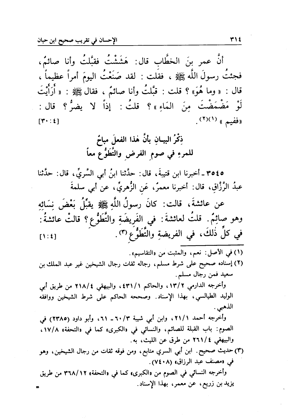 عَنْ عَائِشَةَ، قَالَتْ: كَانَ رَسُولُ اللَّهِ صَلَّى اللَّهُ عَلَيْهِ وَسَلَّمَ يُقَبِّلُ بَعْضَ نِسَائِهِ وَهُوَ صَائِمٌ. قُلْتُ لِعَائِشَةَ: فِي الْفَرِيضَةِ وَالتَّطَوُّعِ؟ قَالَتْ عَائِشَةُ: فِي كُلِّ ذَلِكَ، فِي الْفَرِيضَةِ وَالتَّطَوُّعِ (1) .