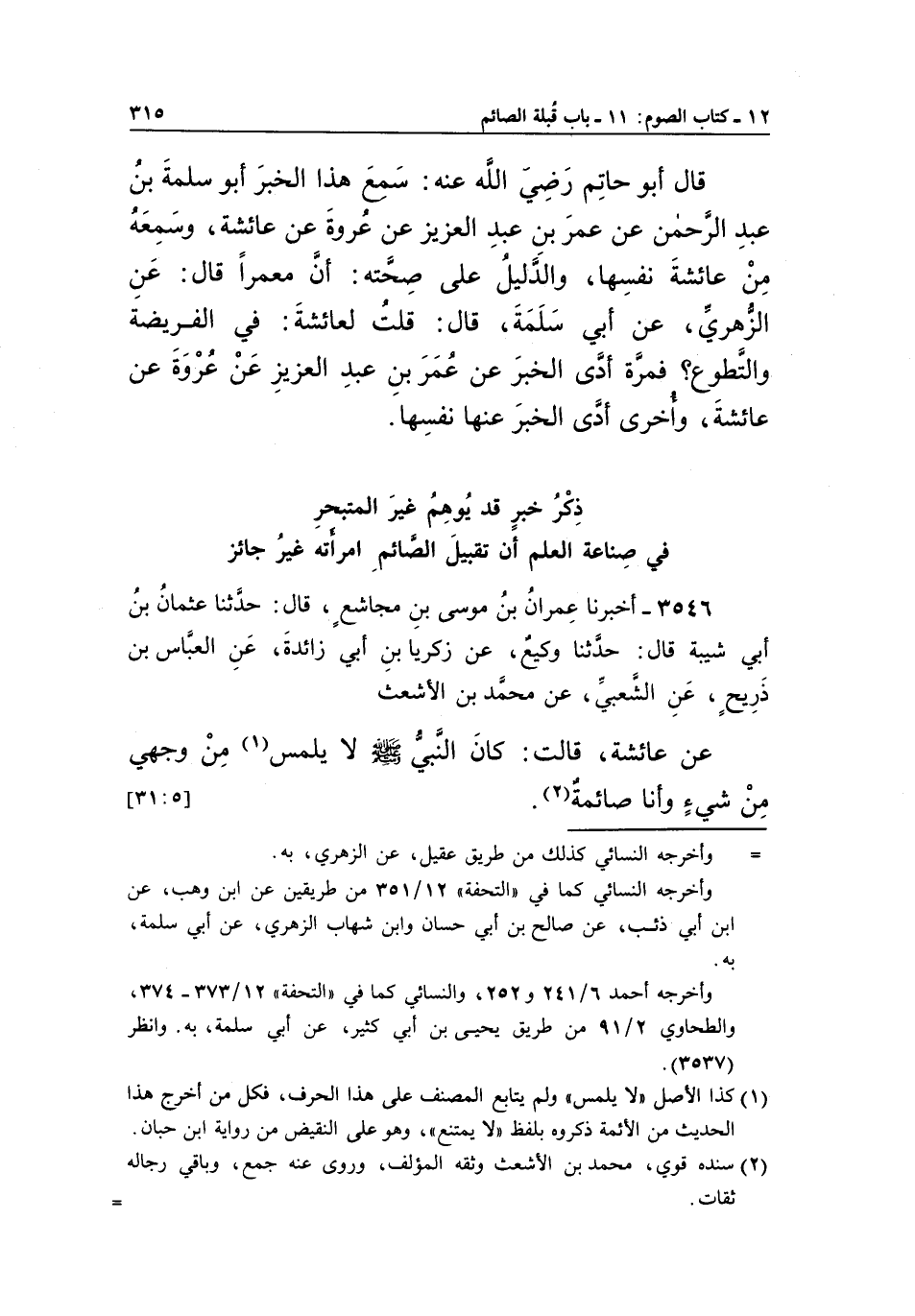عَنْ عَائِشَةَ، قَالَتْ: كَانَ النَّبِيُّ صَلَّى اللَّهُ عَلَيْهِ وَسَلَّمَ لَا يَلْمِسُ (1) من وجهي من شيء وانا صائمة (2) .