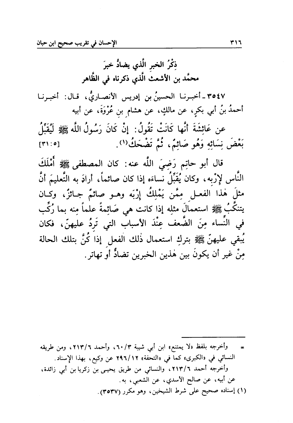 قَالَ أَبُو حَاتِمٍ رَضِيَ اللَّهُ تعالى عَنْهُ: كَانَ الْمُصْطَفَى صَلَّى اللَّهُ عَلَيْهِ وَسَلَّمَ أَمْلَكُ النَّاسِ لِإِرْبِهِ، وَكَانَ يُقَبِّلُ نِسَاءَهُ إِذَا كَانَ صَائِمًا، أَرَادَ بِهِ التَّعْلِيمَ أَنَّ مِثْلَ هَذَا الْفِعْلِ مِمَّنْ يَمْلِكُ إِرْبَهُ وَهُوَ صَائِمٌ جَائِزٌ، وَكَانَ يَتَنَكَّبُ صَلَّى اللَّهُ عَلَيْهِ وَسَلَّمَ اسْتِعْمَالَ مِثْلِهِ إِذَا كَانَتْ هِيَ صَائِمَةٌ عِلْمًا مِنْهُ بِمَا رُكِّبَ فِي النِّسَاءِ مِنَ الضَّعْفِ عِنْدَ الْأَسْبَابِ الَّتِي تَرِدُ عَلَيْهِنَّ، فَكَانَ يُبْقِي عليهن صلى الله عليه وسلم بترك ذَلِكَ الْفِعْلِ إِذَا كُنَّ بِتِلْكَ الْحَالَةِ مِنْ غَيْرِ أَنْ يَكُونَ بَيْنَ هَذَيْنِ الْخَبَرَيْنِ تَضَادٌ أو تهاتر.
