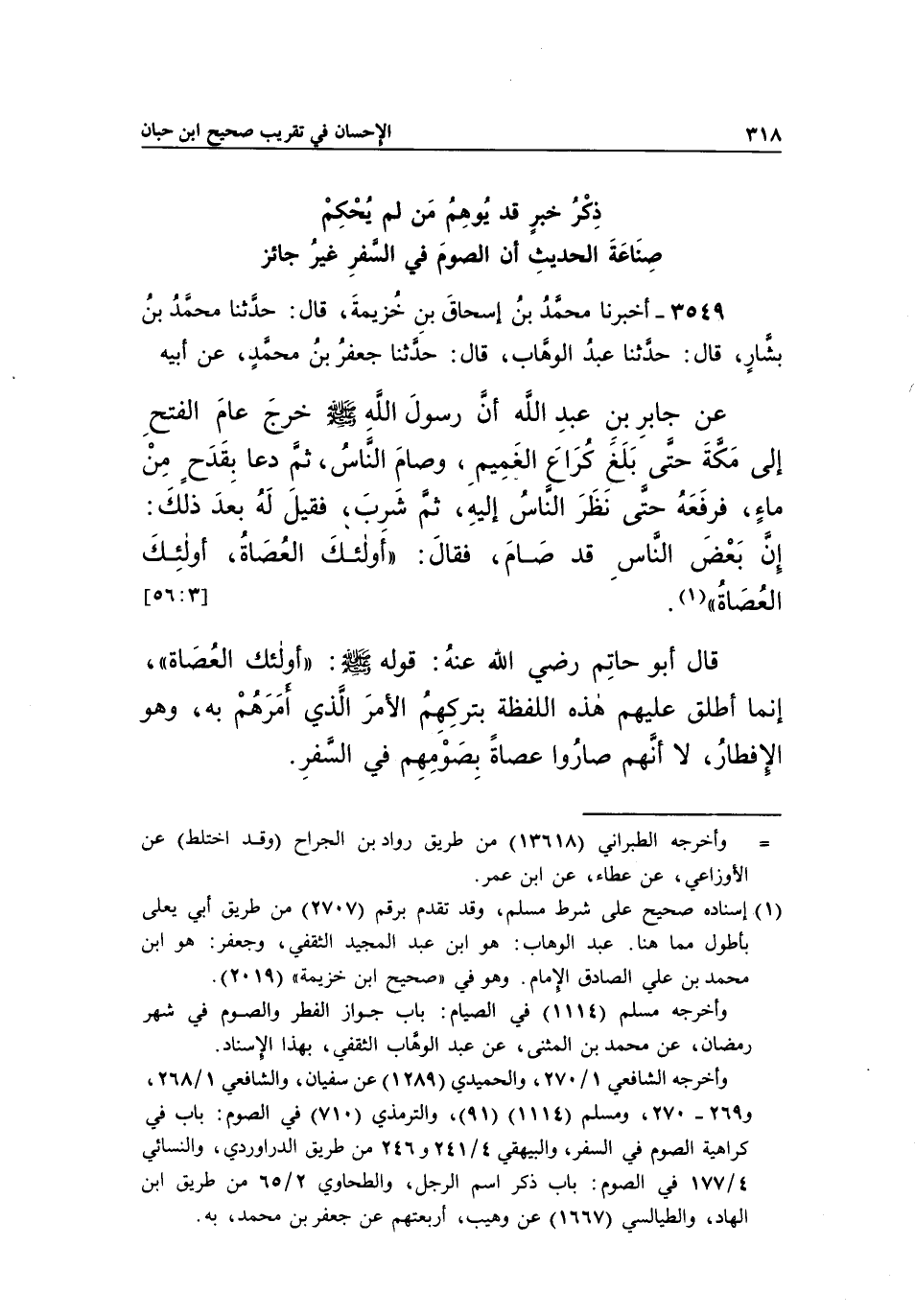 قَالَ أَبُو حَاتِمٍ رَضِيَ اللَّهُ تعالى عَنْهُ: قَوْلُهُ صَلَّى اللَّهُ عَلَيْهِ وَسَلَّمَ: "أُولَئِكَ الْعُصَاةُ"، إِنَّمَا أَطْلَقَ عَلَيْهِمْ هَذِهِ اللَّفْظَةَ بِتَرْكِهِمُ الْأَمْرَ الَّذِي أَمَرَهُمْ بِهِ، وَهُوَ الْإِفْطَارُ، لَا أنهم صاروا عصاة بصومهم في السفر. ذِكْرُ خَبَرٍ قَدْ يُوهِمُ مَنْ لَمْ يُحْكِمْ صِنَاعَةَ الْحَدِيثِ أَنَّ الصَّوْمَ فِي السَّفَرِ غَيْرُ جَائِزٍ