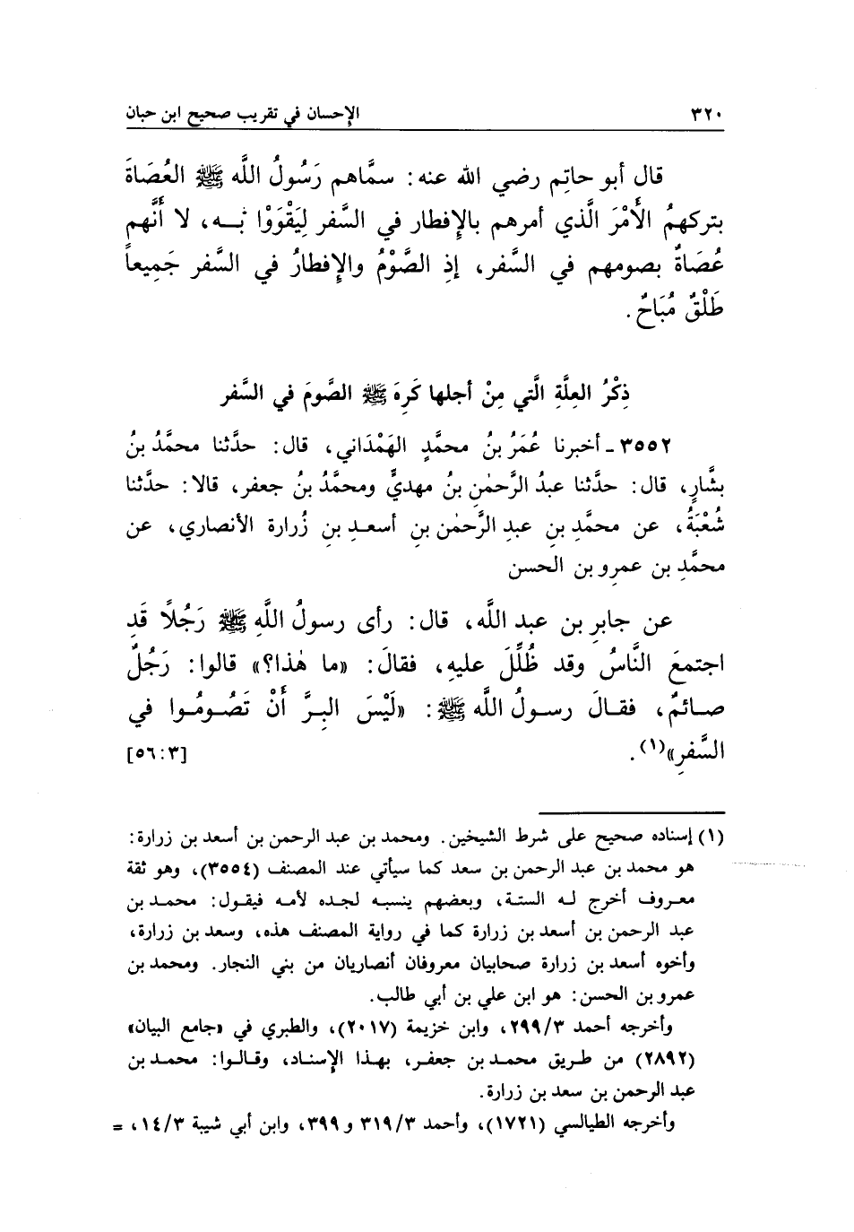 قال أبو حاتم رضى الله تعالى عَنْهُ: سَمَّاهُمْ رَسُولُ اللَّهِ صَلَّى اللَّهُ عَلَيْهِ وَسَلَّمَ الْعُصَاةَ بِتَرْكِهِمُ الْأَمْرَ الَّذِي أَمَرَهُمْ بِالْإِفْطَارِ فِي السَّفَرِ لِيَقْوَوْا بِهِ، لَا أَنَّهُمْ عُصَاةٌ بِصَوْمِهِمْ فِي السَّفَرِ، إِذِ الصَّوْمُ وَالْإِفْطَارُ فِي السفر جميعا طلق مباح.