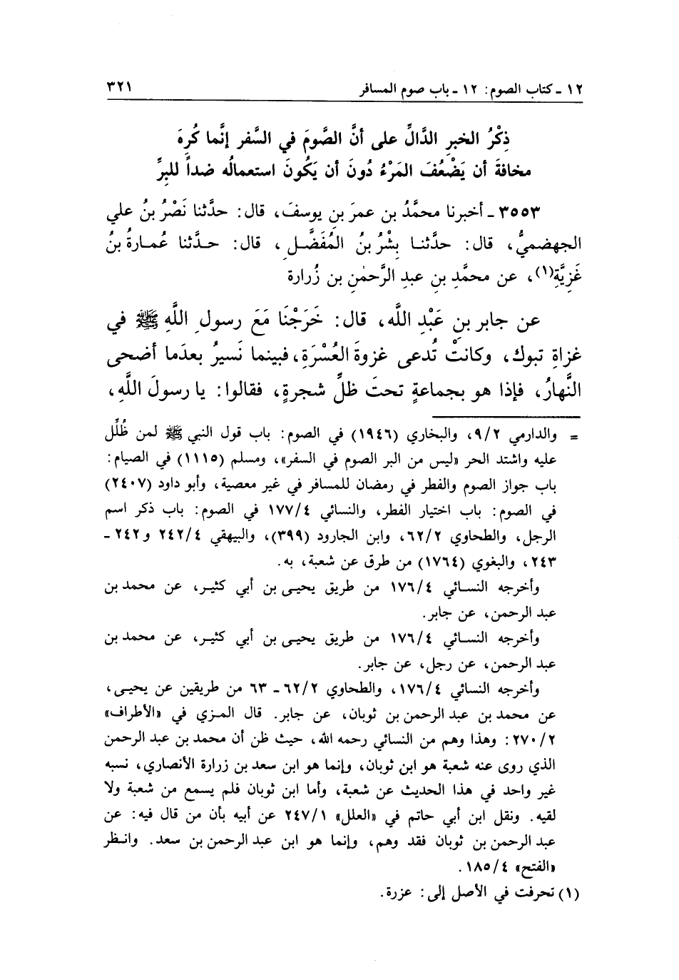 3553 - أَخْبَرَنَا مُحَمَّدُ بْنُ عُمَرَ بْنِ يُوسُفَ، قَالَ: حَدَّثَنَا نَصْرُ بْنُ عَلِيٍّ الْجَهْضَمِيُّ، قَالَ: حَدَّثَنَا بِشْرِ بْنِ الْمُفَضَّلِ، قَالَ: حَدَّثَنَا عُمَارَةُ بْنُ غَزِيَّةَ (1) ، عَنْ مُحَمَّدِ بْنِ عَبْدِ الرَّحْمَنِ بْنِ زُرَارَةَ