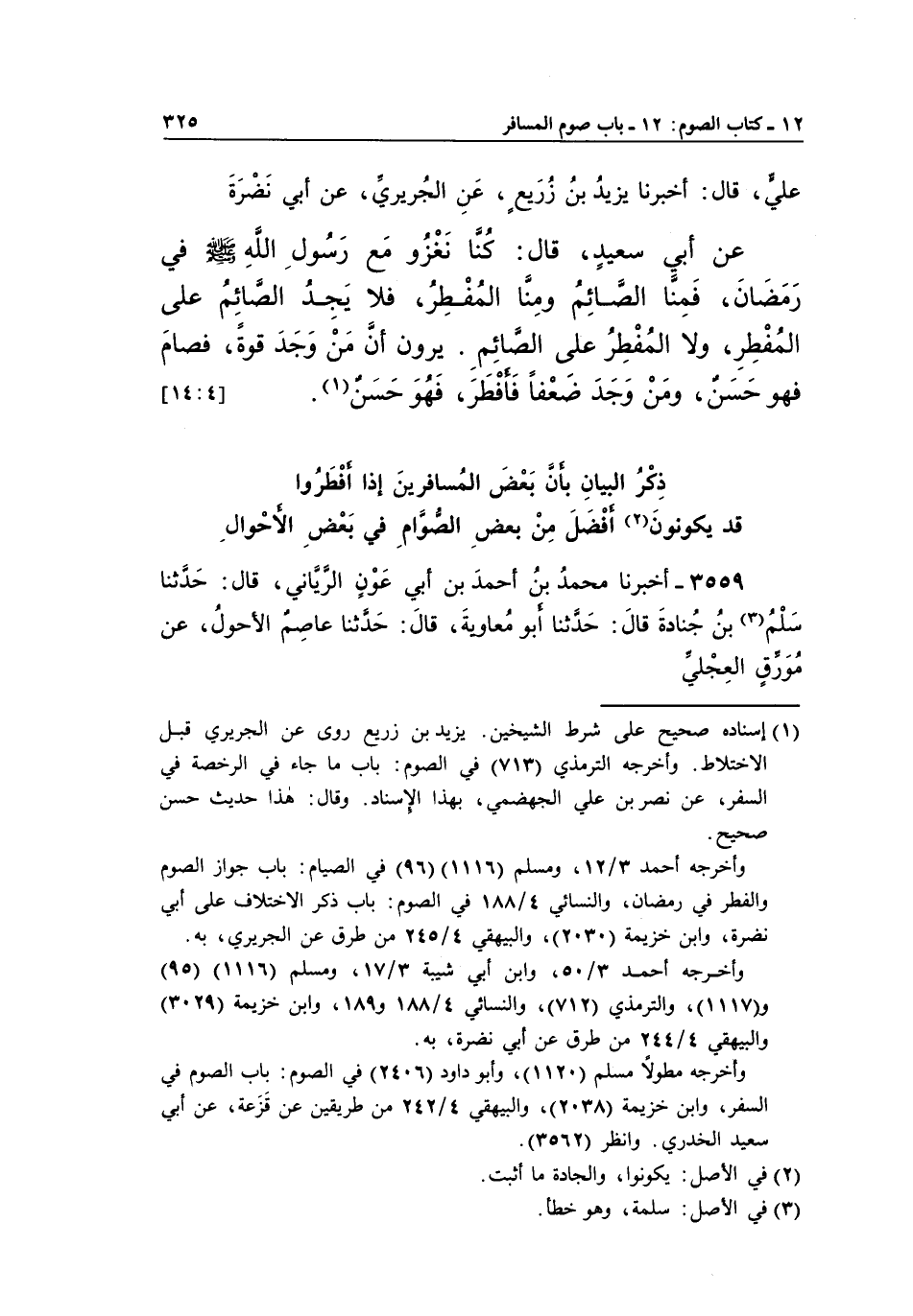 عَنْ أَبِي سعيد، قَالَ: كُنَّا نَغْزُو مَعَ رَسُولِ اللَّهِ صَلَّى اللَّهُ عَلَيْهِ وَسَلَّمَ فِي رَمَضَانَ، فَمِنَّا الصَّائِمُ وَمِنَّا الْمُفْطِرُ، فَلَا يَجِدُ الصَّائِمُ عَلَى الْمُفْطِرِ، وَلَا الْمُفْطِرُ عَلَى الصَّائِمِ. يَرَوْنَ أَنَّ مَنَ وَجَدَ قُوَّةً، فَصَامَ فَهُوَ حَسَنٌ، وَمَنْ وَجَدَ ضعفا فافطر، فهو حسن (1) .