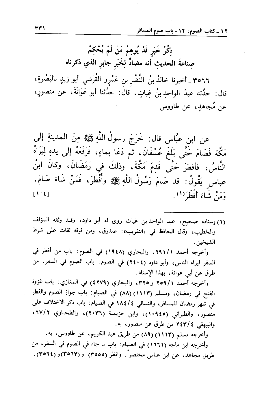 عَنِ ابْنِ عَبَّاسٍ قَالَ: خَرَجَ رَسُولُ اللَّهِ صَلَّى اللَّهُ عَلَيْهِ وَسَلَّمَ مِنَ الْمَدِينَةِ إِلَى مَكَّةَ فَصَامَ حَتَّى بَلَغَ عُسْفَانَ، ثُمَّ دَعَا بِمَاءٍ، فَرَفَعَهُ إِلَى يَدِهِ لِيَرَاهُ النَّاسُ، فَأَفْطَرَ حَتَّى قَدِمَ مَكَّةَ، وَذَلِكَ فِي رَمَضَانَ، وَكَانَ ابْنُ عَبَّاسٍ يَقُولُ: قَدْ صَامَ رَسُولُ اللَّهِ صَلَّى اللَّهُ عَلَيْهِ وَسَلَّمَ وَأَفْطَرَ، فَمَنْ شَاءَ صام، ومن شاء أفطر (1) .