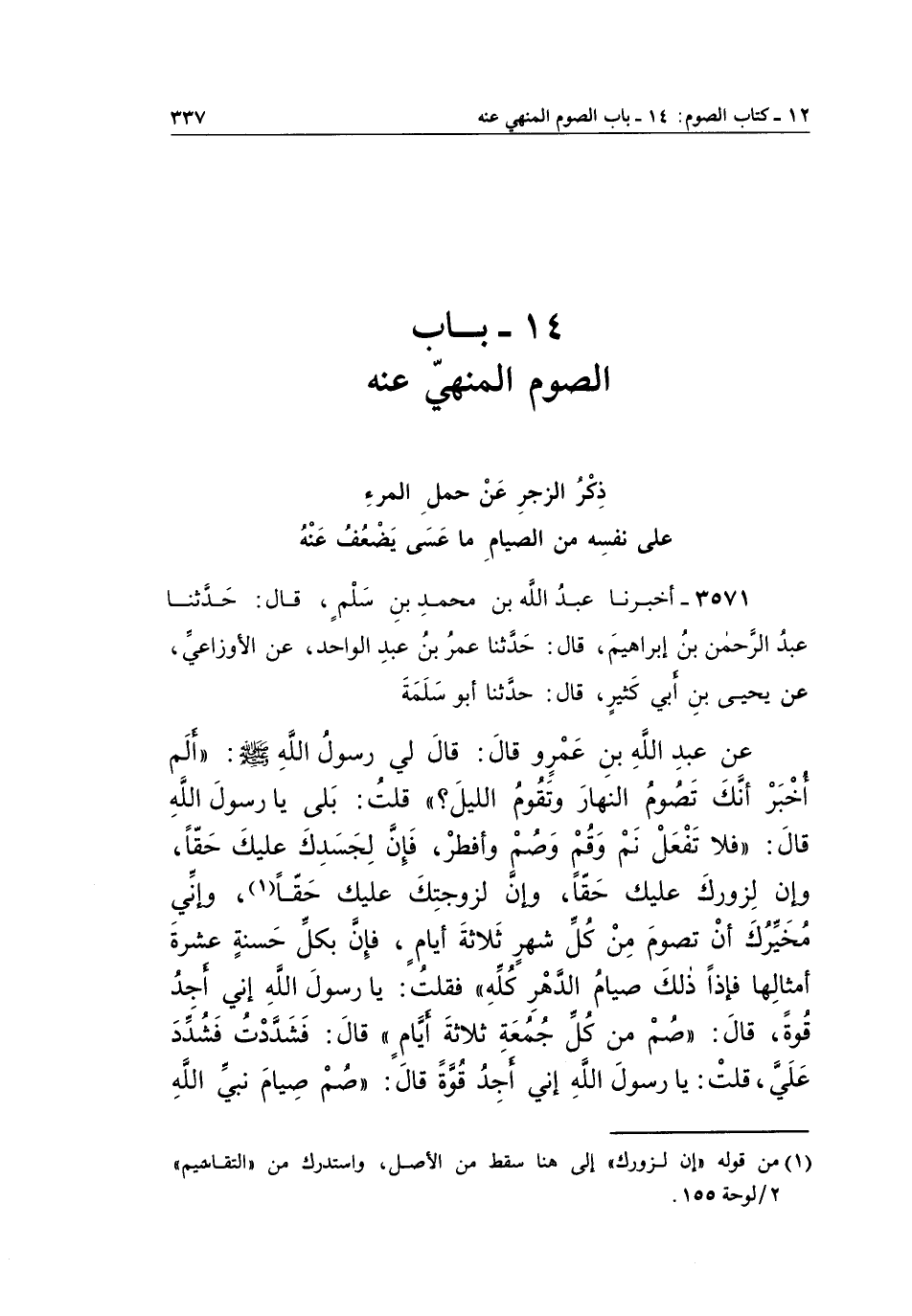 عَنْ عَبْدِ اللَّهِ بْنِ عَمْرٍو قَالَ: قَالَ لِي رَسُولُ اللَّهِ صَلَّى اللَّهُ عَلَيْهِ وَسَلَّمَ: "أَلَمْ أُخْبَرْ أَنَّكَ تَصُومُ النَّهَارَ وَتَقُومُ اللَّيْلَ؟ " قُلْتُ: بَلَى يَا رَسُولَ اللَّهِ قَالَ: "فَلَا تَفْعَلْ نَمْ وَقُمْ وَصُمْ وَأَفْطِرْ، فَإِنَّ لِجَسَدِكَ عَلَيْكَ حَقًّا، وَإِنَّ لِزَوْرِكَ عَلَيْكَ حَقًّا، وَإِنَّ لِزَوْجَتِكَ عَلَيْكَ حَقًّا (1) ، وَإِنِّي مُخَيِّرُكَ أَنْ تَصُومَ مِنْ كُلِّ شَهْرٍ ثَلَاثَةَ أَيَّامٍ، فَإِنَّ بِكُلِّ حَسَنَةٍ عَشَرَةُ أَمْثَالِهَا فَإِذَا ذَلِكَ صِيَامُ الدَّهْرِ كُلِّهِ" فَقُلْتُ: يَا رَسُولَ اللَّهِ إِنِّي أَجِدُ قُوَّةً، قَالَ: "صُمْ مِنْ كُلِّ جُمُعَةٍ ثَلَاثَةَ أَيَّامٍ" قَالَ: فَشَدَدْتُ فَشُدِّدَ عليَّ، قُلْتُ: يَا رَسُولَ اللَّهِ إِنِّي أَجِدُ قُوَّةً قَالَ: "صُمْ صِيَامَ نَبِيِّ الله