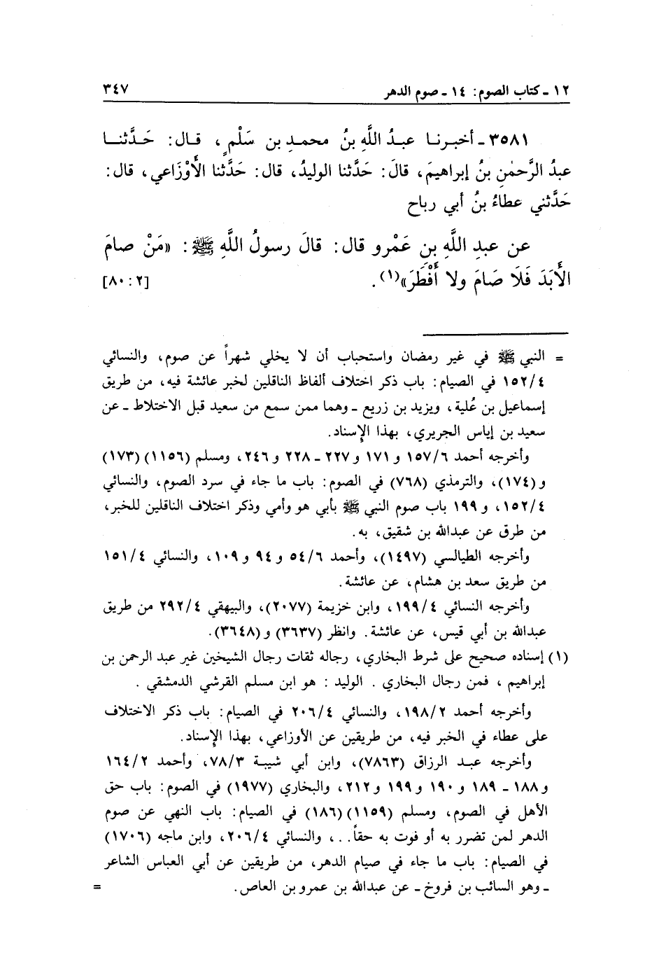 عَنْ عَبْدِ اللَّهِ بْنِ عَمْرٍو قَالَ: قَالَ رَسُولُ اللَّهِ صَلَّى اللَّهُ عَلَيْهِ وَسَلَّمَ: "مَنْ صَامَ الْأَبَدَ فَلَا صام ولا أفطر" (1) .