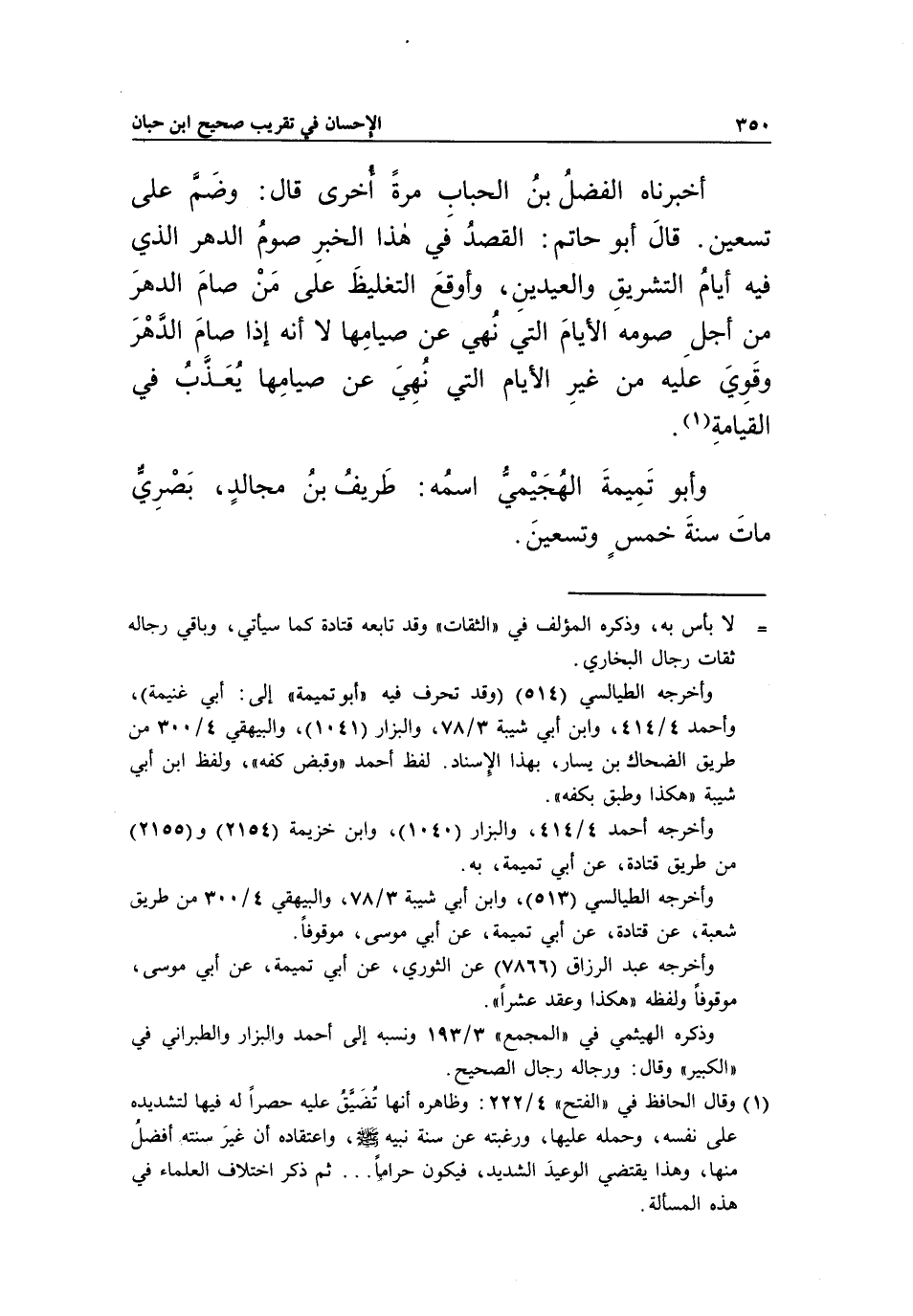 أَخْبَرَنَاهُ الْفَضْلُ بْنُ الْحُبَابِ مَرَّةً أُخْرَى قَالَ: وَضَمَّ عَلَى تِسْعِينَ. قَالَ أَبُو حَاتِمٍ: الْقَصْدُ فِي هَذَا الْخَبَرِ صَوْمُ الدَّهْرِ الَّذِي فِيهِ أَيَّامُ التَّشْرِيقِ وَالْعِيدَيْنِ، وَأَوْقَعَ التَّغْلِيظَ عَلَى مَنْ صَامَ الدَّهْرَ مِنْ أَجْلِ صَوْمِهِ الْأَيَّامَ الَّتِي نُهِيَ عَنْ صِيَامِهَا لَا أَنَّهُ إِذَا صَامَ الدَّهْرَ وَقَوِيَ عَلَيْهِ مِنْ غَيْرِ الْأَيَّامِ الَّتِي نُهِيَ عَنْ صِيَامِهَا يُعَذَّبُ فِي الْقِيَامَةِ (1) .