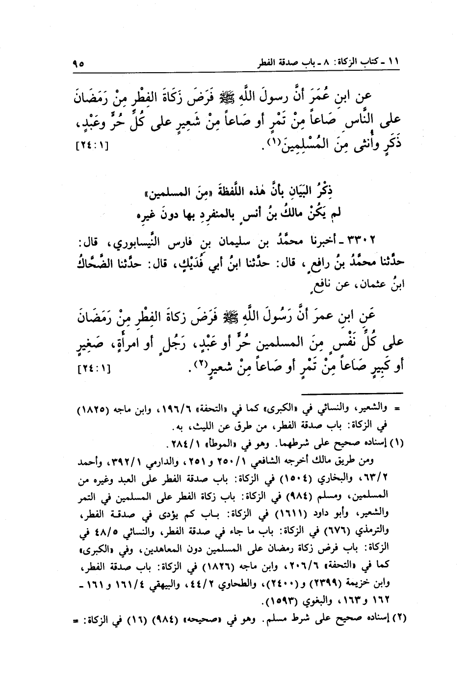 ومن طريق مالك أخرجه الشافعي 1/250 و 251، والدارمي 1/392، وأحمد 2/63، البخاري "1504" في الزكاة: باب صدقة الفطر على العبد وغيره من المسلمين، ومسلم "984" في الزكاة: باب زكاة الفطر على المسلمين في التمر والشعير، وأبو داود "1611" في الزكاة: باب كم يؤدى في صدقة الفطر، والترمذي "676" في الزكاة: باب ما جاء في صدقة الفطر، والنسائي 5/48 في الزكاة: باب فرض زكاة رمضان على المسلمين دون المعاهدين، وفي "الكبرى" كما في "التحفة" 6/206، وابن ماجه "1826" في الزكاة: باب صدقة الفطر، وابن خريمة "2399" و "2400"، والطحاوي 2"44، واليهقي 4/161 و 161- 162 و 163، والبغوي "1593".