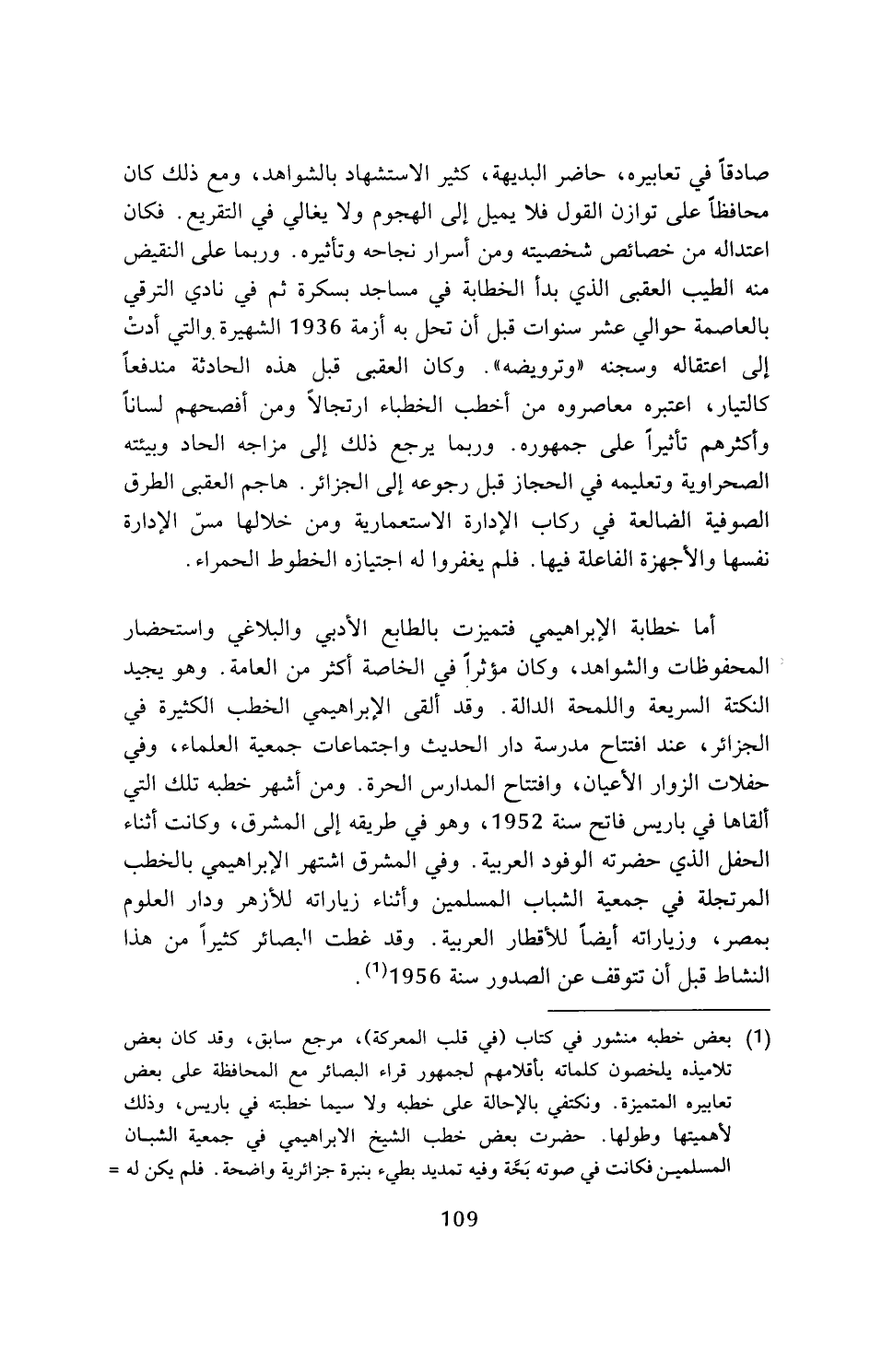 (¬1) بعض خطبه منشور في كتاب (في قلب المعركة)، مرجع سابق، وقد كان بعض تلاميذه يلخصون كلماته بأقلامهم لجمهور قراء البصائر مع المحافظة على بعض تعابيره المتميزة. ونكتفي بالإحالة على خطبه ولا سيما خطبته في باريس، وذلك لأهميتها وطولها. حضرت بعض خطب الشيخ الابراهيمي في جمعية الشبان المسلمين فكانت في صوته بحة وفيه تمديد بطيء بنبرة جزائرية واضحة. فلم يكن له =