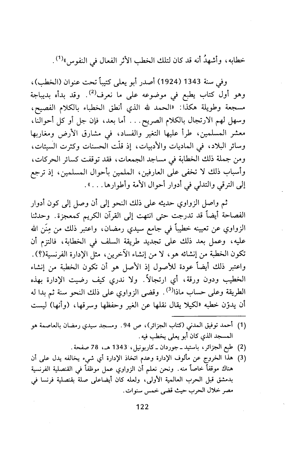 ثم واصل الزواوي حديثه على ذلك النحو إلى أن وصل إلى كون أدوار الفصاحة أيضا قد تدرجت حتى انتهت إلى القرآن الكريم كمعجزة. وحدثنا الزواوي عن تعيينه خطيبا في جامع سيدي رمضان، واعتبر ذلك من منن الله عليه، وعمل بعد ذلك على تجديد طريقة السلف في الخطابة، فالتزم أن تكون الخطبة من إنشائه هو، لا من إنشاء الآخرين، مثل الإدارة الفرنسية (؟). واعتبر ذلك أيضا عودة للأصول إذ الأصل هو أن تكون الخطبة من إنشاء الخطيب ودون ورقة، أي ارتجالا. ولا ندري كيف رضيت الإدارة بهذه الطريقة وعلى حساب ماذا (¬3). وقضى الزواوي على ذلك النحو سنة ثم بدا له أن يدوون خطبه (لكيلا يقال نقلها عن الغير وحفظها وسرقها، (وأنها) ليست