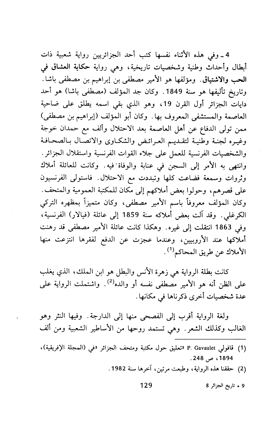 4 - وفي هذه الأثناء نفسها كتب أحد الجزائريين رواية شعبية ذات أبطال وأحداث وطنية وشخصيات تاريخية، وهي رواية حكاية العشاق في الحب والاشتياق. ومؤلفها هو الأمير مصطفى بن إبراهيم بن مصطفى باشا. وتاريخ تأليفها هو سنة 1849. وكان جد المؤلف (مصطفى باشا) هو أحد دايات الجزائر أول القرن 19، وهو الذي بقي اسمه يطلق على ضاحية العاصمة والمستشفى المعروف بها. وكان أبو المؤلف (إبراهيم بن مصطفى) ممن تولى الدفاع عن أهل العاصمة بعد الاحتلال وألف مع حمدان خوجة وغيره لجنة وطنية لتقديم العرائض والشكاوى والاتصال بالصحافة والشخصيات الفرنسية للعمل على جلاء القوات الفرنسية واستقلال الجزائر. وانتهى به الأمر إلى السجن في عنابة والوفاة فيه. وكانت للعائلة أملاك وثروات وسمعة فضاعت كلها ونددت مع الاحتلال. فاستولى الفرنسيون على قصرهم، وحولوا بعض أملاكهم إلى مكان للمكتبة العمومية والمتحف. وكان المؤلف معروفا باسم الأمير مصطفى، وكان متميزا بمظهره التركي الكرغلي. وقد آلت بعض أملاكه سنة 1859 إلى عائلة (فيالار) الفرنسية، وفي 1863 انتقلت إلى غيره. وهكذا كانت عائلة الأمير مصطفى قد رهنت أملاكها عند الأروبيين، وعندما عجزت عن الدفع لفقرها انتزعت منها الأملاك عن طريق المحاكم (¬1).
