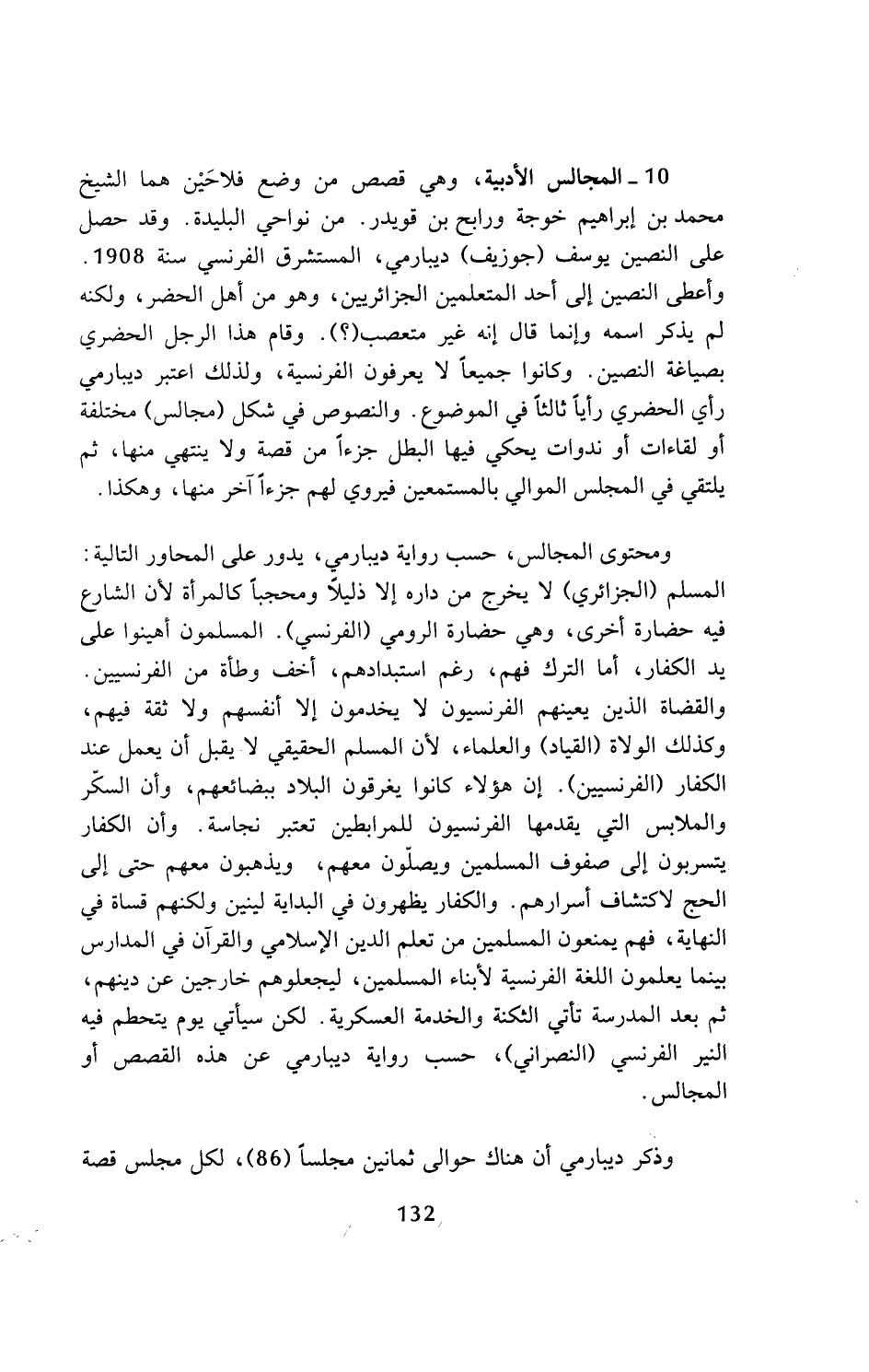 10 - المجالس الأدبية، وهي قصص من وضع فلاحين هما الشيخ محمد بن إبراهيم خوجة ورابح بن قويدر. من نواحي البليدة. وقد حصل على النصين يوسف (جوزيف) ديبارمي، المستشرق الفرنسي سنة 1908. وأعطى النصين إلى أحد المتعلمين الجزائريين، وهو من أهل الحضر، ولكنه لم يذكر اسمه وإنما قال إنه غير متعصب (؟). وقام هذا الرجل الحضري بصياغة النصين. وكانوا جميعا لا يعرفون الفرنسية، ولذلك اعتبر ديبارمي رأي الحضري رأي ثالثا في الموضوع. والنصوص في شكل (مجالس) مختلفة أو لقاءات أو ندوات يحكي فيها البطل جزءا من قصة ولا ينتهي منها، ثم يلتقي في المجلس الموالي بالمستمعين فيروي لهم جزءا آخر منها، وهكذا.