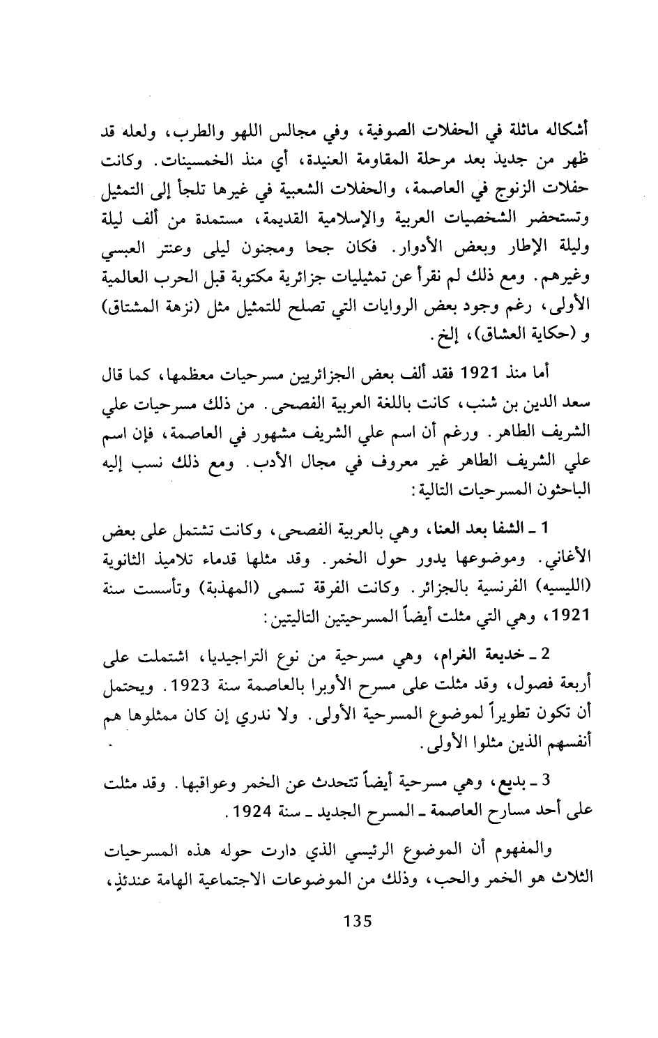 1 - الشفا بعد العنا، وهي بالعربية الفصحى، وكانت تشتمل على بعض الأغاني. وموضوعها يدور حول الخمر. وقد مثلها قدماء تلاميذ الثانوي (الليسيه) الفرنسية بالجزائر. وكانت الفرقة تسمى (المهذبة) وتأسست سنة 1921، وهي التي مثلت أيضا المسرحيتين التاليتين: