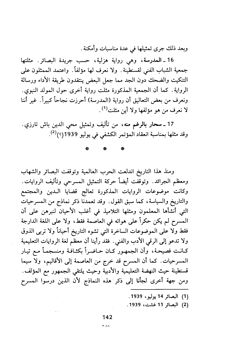 16 - المدرسة، وهي رواية هزلية، حسب جريدة البصائر. مثلتها جمعية الشباب الفني لقسنطينة. ولا نعرف لها مؤلفا. واعتمد الممثلون على التنكيت والضحك دون الجد مما جعل البعض ينتقدون طريقة الأداء ورسالة الرواية. كما أن الجمعية المذكورة مثلت رواية أخرى حول المولد النبوي. ونعرف من بعض التعاليق أن رواية (المدرسة) أحرزت نجاحا كبيرا. غير أننا لا نعرف من هو مؤلفها ولا أين مثلت (¬1).