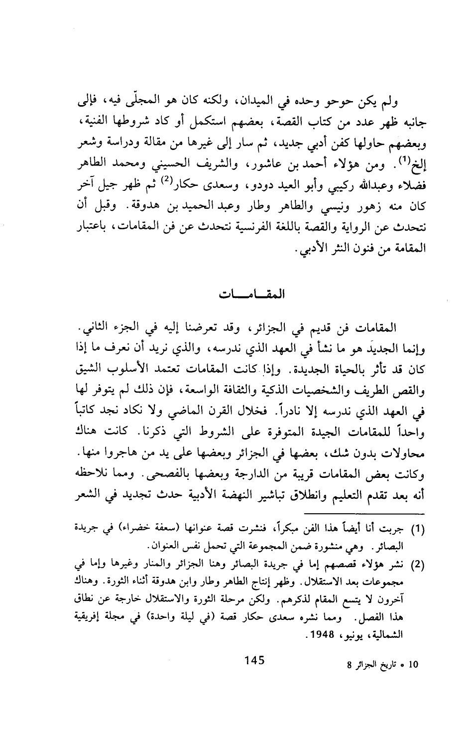 (¬2) نشر هؤلاء قصصهم إما في جريدة البصائر وهنا الجزائر والمنار وغيرها وإما في مجموعات بعد الاستقلال. وظهر إنتاج الطاهر وطار وابن هدوقة أثناء الثورة. وهناك آخرون لا يتسع المقام لذكرهم. ولكن مرحلة الثورة والاستقلال خارجة عن نطاق هذا الفصل. ومما نشره سعدي حكار قصة (في ليلة واحدة) في مجلة إفريقية الشمالية، يونيو، 1948.