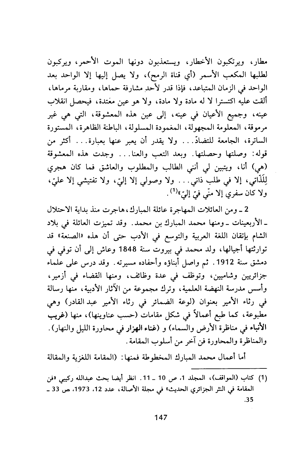 (¬1) كتاب (المواقف)، المجلد 1، ص 10 - 11. انظر أيضا بحث عبد الله ركيبي (فن المقامة في النثر الجزائري الحديث) في مجلة الأصالة، عدد 12، 1973، ص 33 - 35.