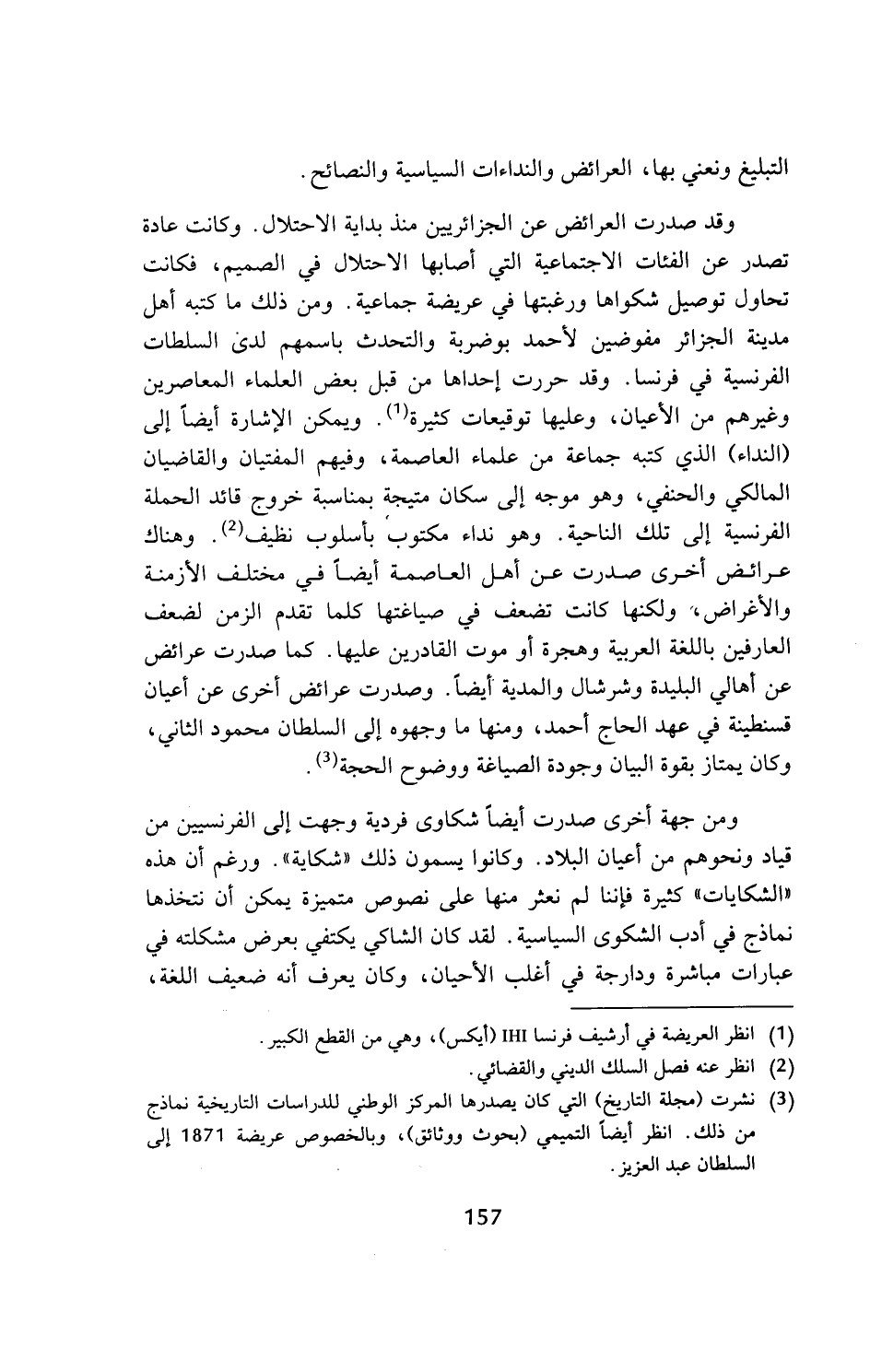 وقد صدرت العرائض عن الجزائريين منذ بداية الاحتلال. وكانت عادة تصدر عن الفئات الاجتماعية التي أصابها الاحتلال في الصميم، فكانت تحاول توصيل شكواها ورغبتها في عريضة جماعية. ومن ذلك ما كتبه أهل مدينة الجزائر مفوضين لأحمد بوضربة والتحدث باسمهم لدى السلطات الفرنسية في فرنسا. وقد حررت إحداها من قبل بعض العلماء المعاصرين وغيرهم من الأعيان، وعليها توقيعات كثيرة (¬1). ويمكن الإشارة أيضا إلى (النداء) الذي كتبه جماعة من علماء العاصمة، وفيهم المفتيان والقاضيان المالكي والحنفي، وهو موجه إلى سكان متيجة بمناسبة خروج قائد الحملة الفرنسية إلى تلك الناحية. وهو نداء مكتوبة بأسلوب نظيف (¬2). وهناك عرائض أخرى صدرت عن أهل العاصمة أيضا في مختلف الأزمنة والأغراض، ولكنها كانت تضعف في صياغتها كلما تقدم الزمن لضعف العارفين باللغة العربية وهجرة أو موت القادرين عليها. كما صدرت عرائض عن أهالي البليدة وشرشال والمدية أيضا. وصدرت عرائض أخرى عن أعيان قسنطينة في عهد الحاج أحمد، ومنها ما وجهوه إلى السلطان محمود الثاني، وكان يمتاز بقوة البيان وجودة الصياغة ووضوح الحجة (¬3).