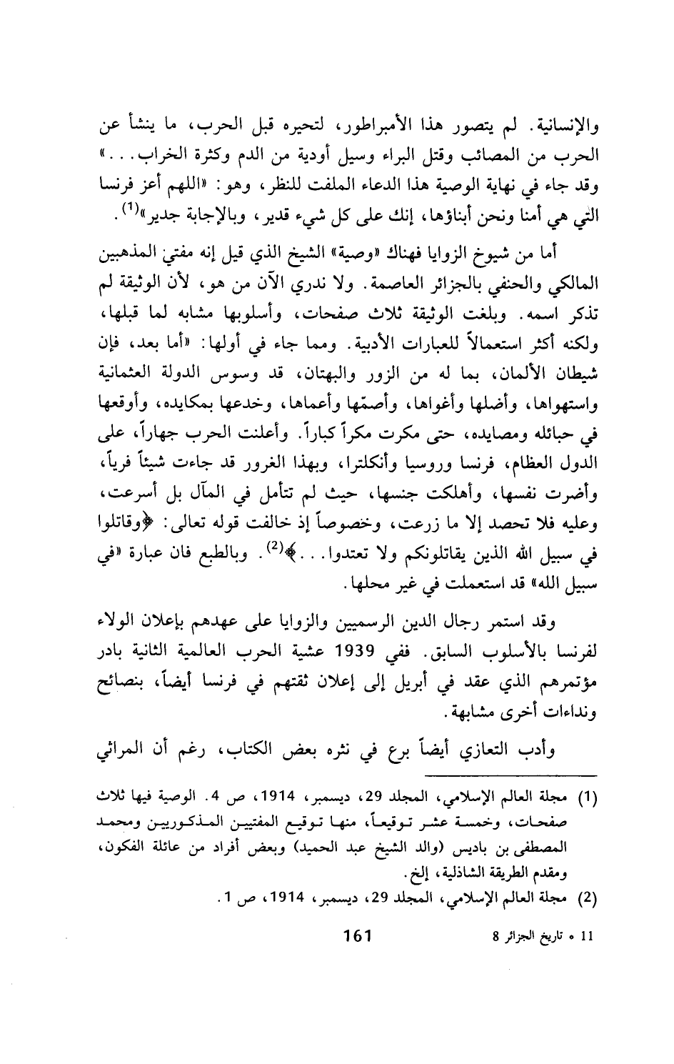 أما من شيوخ الزوايا فهناك (وصية) الشيخ الذي قيل إنه مفتي المذهبين المالكي والحنفي بالجزائر العاصمة. ولا ندري الآن من هو، لأن الوثيقة لم تذكر اسمه. وبلغت الوثيقة ثلاث صفحات، وأسلوبها مشابه لما قبلها، ولكنه أكثر استعمالا للعبارات الأدبية. ومما جاء في أولها: (أما بعد، فإن شيطان الألمان، بما له من الزور والبهتان، قد وسوس الدولة العثمانية واستهواها، وأضلها وأغواها، وأصمها وأعماها، وخدعها بمكايده، وأوقعها في حبائله ومصايده، حتى مكرت مكرا كبارا. وأعلنت الحرب جهارا، على الدول العظام، فرنسا وروسيا وانكلترا، وبهذا الغرور قد جاءت شيئا فريا، وأضرت نفسها، وأهلكت جنسها، حيث لم تتأمل في المآل بل أسرعت، وعليه فلا تحصد إلا ما زرعت، وخصوصا إذ خالفت قوله تعالى: {وقاتلوا في سبيل الله الذين يقاتلونكم ولا تعتدوا ...} (¬2). وبالطبع فإن عبارة (في سبيل الله) قد استعملت في غير محلها.