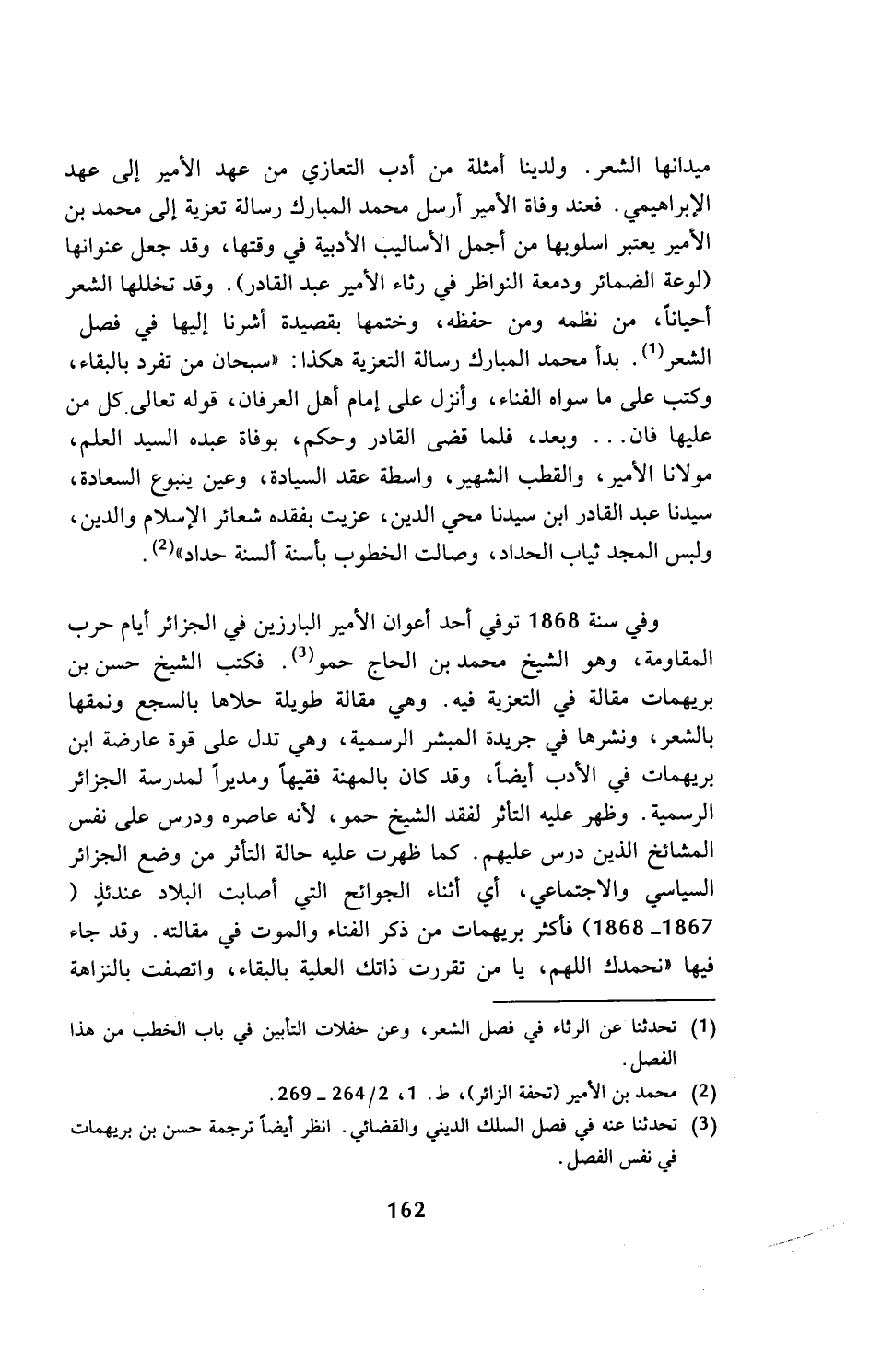 ميدانها الشعر. ولدينا أمثلة من أدب التعازي من عهد الأمير إلى عهد الإبراهيمي. فعند وفاة الأمير أرسل محمد المبارك رسالة تعزية إلى محمد بن الأمير يعتبر أسلوبها من أجمل الأساليب الأدبية في وقتها، وقد جعل عنوانها (لوعة الضمائر ودمعة النواظر في رثاء الأمير عبد القادر). وقد تخللها الشعر أحيانا، من نظمه ومن حفظه، وختمها بقصيدة أشرنا إليها في فصل الشعر (¬1). بدأ محمد المبارك رسالة التعزية هكذا: (سبحان من تفرد بالبقاء، وكتب على ما سواه الفناء، وأنزل على إمام أهل العرفان، قوله تعالى: {كل من عليها فان} ... وبعد، فلما قضى القادر وحكم، بوفاة عبده السيد العلم، مولانا الأمير، والقطب الشهير، واسطة عقد السيادة، وعين ينبوع السعادة، سيدنا عبد القادر ابن سيدنا محيي الدين، عزيت بفقده شعائر الإسلام والدين، ولبس المجد ثياب الحداد، وصالت الخطوب بأسنة ألسنة حداد) (¬2).