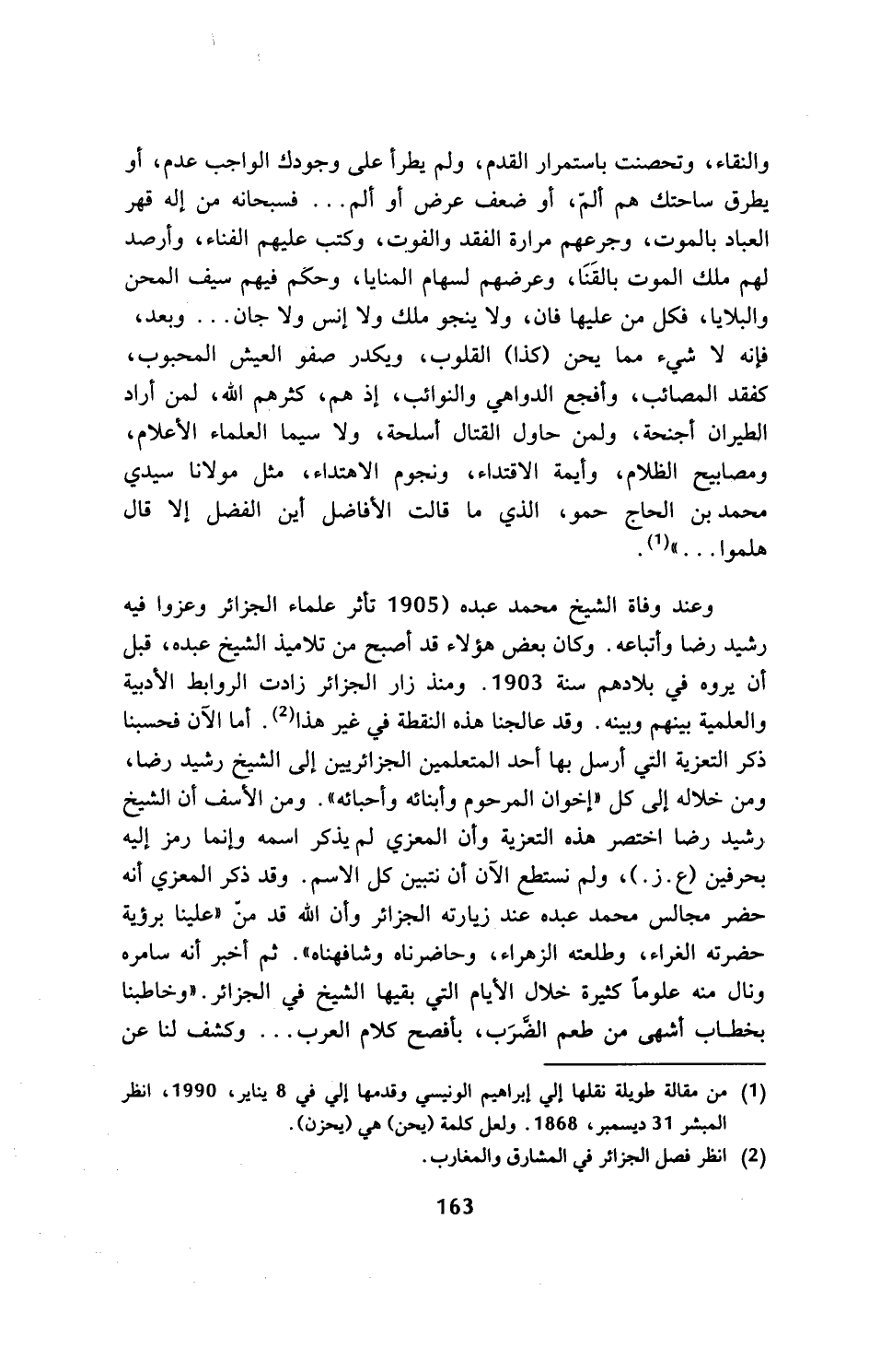 وعند وفاة الشيخ محمد عبده (1905 تأخر علماء الجزائر وعزوا فيه رشيد رضا وأتباعه. وكان بعض هؤلاء قد أصبح من تلاميذ الشيخ عبده، قبل أن يروه في بلادهم سنة 1903. ومنذ زار الجزائر زادت الروابط الأدبية والعلمية بينهم وبينه. وقد عالجنا هذه النقطة في غير هذا (¬2). أما الآن فحسبنا ذكر التعزية التي أرسل بها أحد المتعلمين الجزائريين إلى الشيخ رشيد رضا، ومن خلاله إلى كل (إخوان المرحوم وأبنائه وأحبائه). ومن الأسف أن الشيخ رشيد رضا اختصر هذه التعزية وأن المعزي لم يذكر اسمه وإنما رمز إليه بحرفين (ع. ز.)، ولم نستطع الآن أن نتبين كل الاسم. وقد ذكر المعزي أنه حضر مجالس محمد عبده عند زيارة الجزائر وأن الله قد من (علينا رؤية حضرته الغراء، وطلعته الزهراء، وحاضرناه وشافهناه). ثم أخبر أنه سامره ونال منه علوما كثيرة خلال الأيام التي بقيها الشيخ في الجزائر. (وخاطبنا بخطاب أشهى من طعم الضرب، بأفصح كلام العرب ... وكشف لنا عن