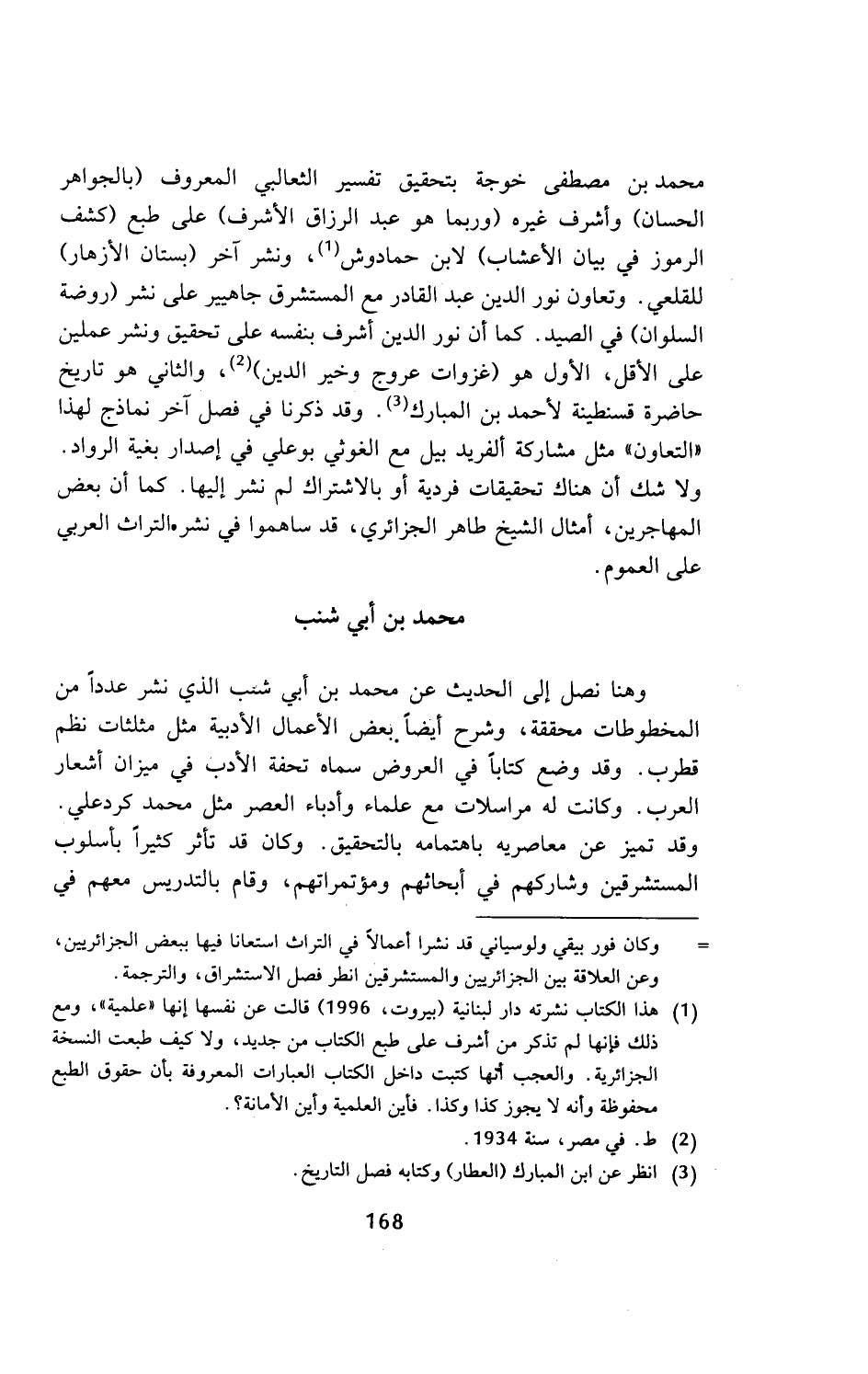 (¬1) هذا الكتاب نشرته دار لبنانية (بيروت، 1996) قالت عن نفسها إنها (علمية)، ومع ذلك فإنها لم تذكر من أشرف على طبع الكتاب من جديد، ولا كيف طبعت النسخة الجزائرية. والعجب أنها كتبت داخل الكتاب العبارات المعروفة بأن حقوق الطبع محفوظة وأنه لا يجوز كذا وكذا. فأين العلمية وأين الأمانة؟.