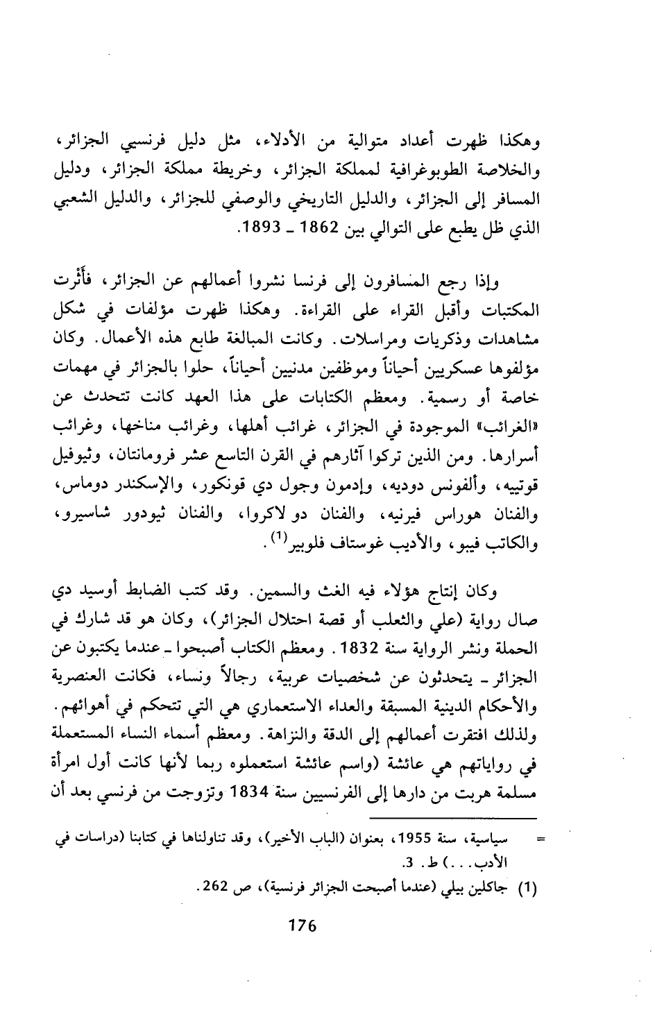 وإذا رجع المسافرون إلى فرنسا نشروا أعمالهم عن الجزائر، فأثرت المكتبات وأقبل القراء على القراءة. وهكذا ظهرت مؤلفات في شكل مشاهدات وذكريات ومراسلات. وكانت المبالغة طابع هذه الأعمال. وكان مؤلفوها عسكريين أحيانا وموظفين مدنيين أحيانا، حلوا بالجزائر في مهمات خاصة أو رسمية. ومعظم الكتابات على هذا العهد كانت تتحدث عن (الغرائب) الموجودة في الجزائر، غرائب أهلها، وغرائب مناخها، وغرائب أسرارها. ومن الذين تركوا آثارهم في القرن التاسع عشر فرومانتان، وثيوفيل قوتييه، وألفونس دوديه، وإدمون وجول دي قونكور، والإسكندر دوماس، والفنان هوراس فيرنيه، والفنان دو لاكروا، والفنان ثيودور شاسيرو، والكاتب فيبو، والأديب غوستاف فلوبير (¬1).