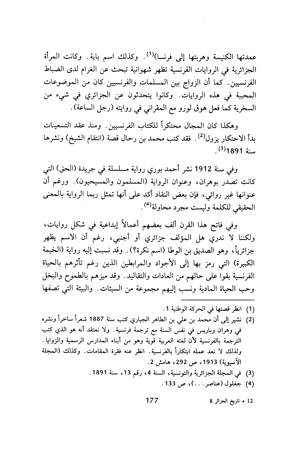 (¬2) نشير إلى أن محمد بن علي بن الطاهر الجباري كتب سنة 1887 شعراء ساخرا ونشره في وهران وباريس في نفس السنة مع ترجمة فرنسية. ولا نعتقد أنه هو الذي كتب الترجمة بالفرنسية لأن لغته العربية قوية وهو من أبناء المدارس الرسمية والزوايا. ولذلك لا نعد عمله ابتكارا بالفرنسية. انظر عنه فقرة المقامات. وكذلك (المجلة الآسيوية) 1913، ص 292، هامش 2.