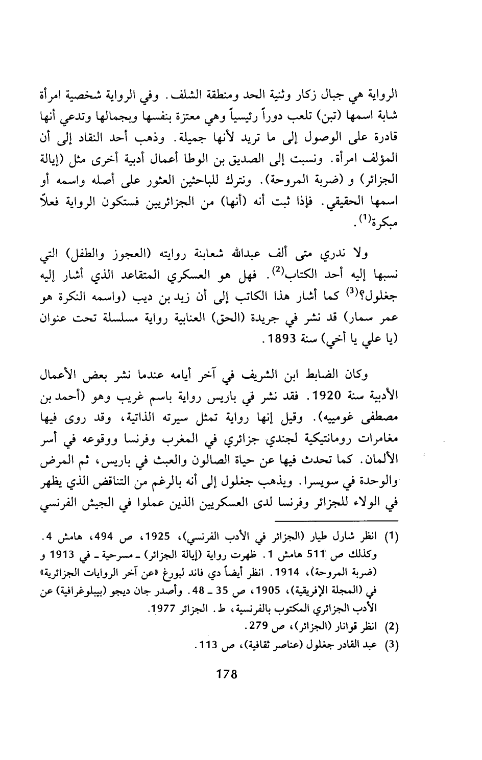 (¬1) انظر شارل طيار (الجزائر في الأدب الفرنسي)، 1925، ص 494، هامش 4. وكذلك ص 511 هامش 1. ظهرت رواية (إيالة الجزائر) - مسرحية - في 1913 و (ضربة المروحة)، 1914. انظر أيضا دي فاند لبورغ (عن آخر الروايات الجزائرية) في (المجلة الإفريقية)، 1905، ص 35 - 48. وأصدر جان ديجو (بيبلوغرافية) عن الأدب الجزائري المكتوب بالفرنسية، ط. الجزائر 1977.