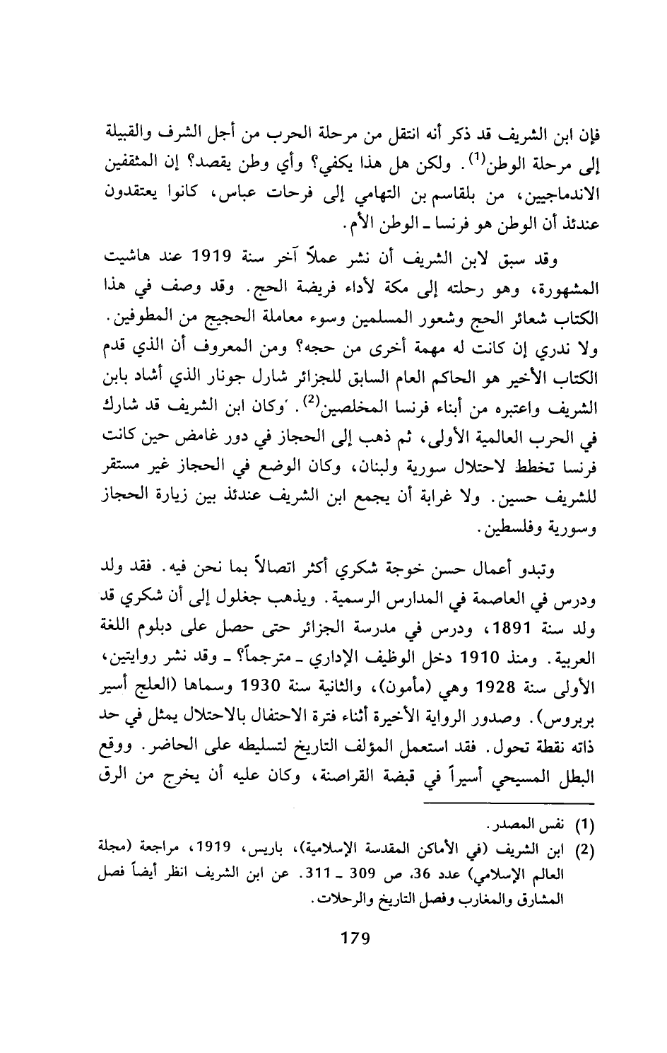 وقد سبق لابن الشريف أن نشر عملا آخر سة 1919 عند هاشيت المشهورة، وهو رحلته إلى مكة لأداء فريضة الحج. وقد وصف في هذا الكتاب شعائر الحج وشعور المسلمين وسوء معاملة الحجيج من المطوفين. ولا ندري إن كانت له مهمة أخرى من حجه؟ ومن المعروف أن الذي قدم الكتاب الأخير هو الحاكم العام السابق الجزائر شارل جونار الذي أشاد بابن الشريف واعتبره من أبناء فرنسا المخلصين (¬2). وكان ابن الشريف قد شارك في الحرب العالمية الأولى، ثم ذهب إلى الحجاز في دور غامض حين كانت فرنسا تخطط لاحتلال سورية ولبنان، وكان الوضع في الحجاز غير مستقر للشريف حسين. ولا غرابة أن يجمع ابن الشريف عندئذ بين زيارة الحجاز وسورية وفلسطين.