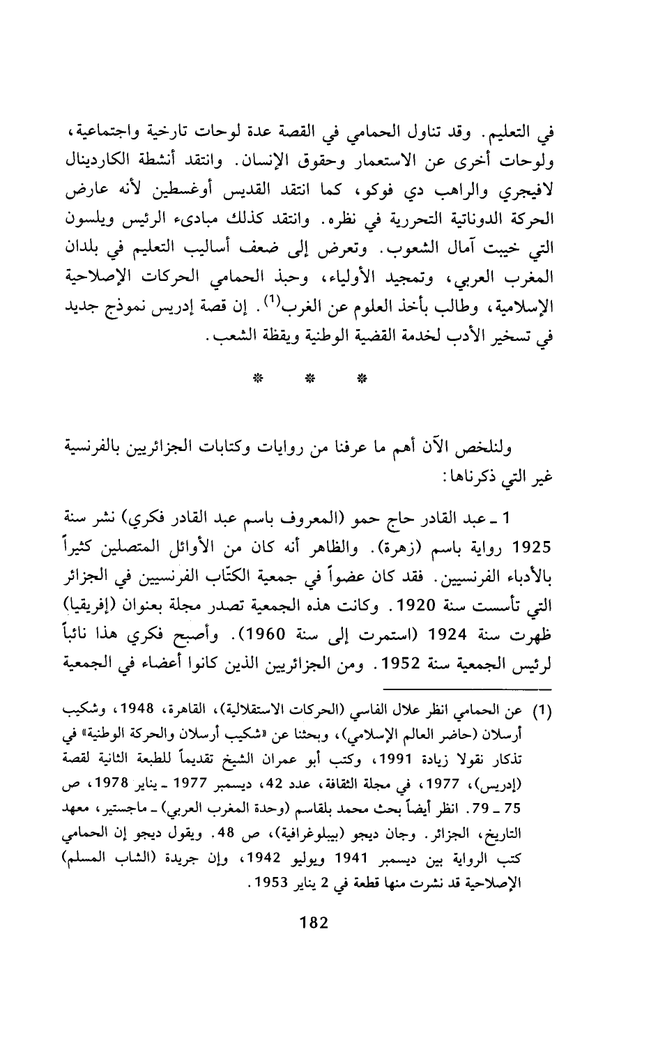 (¬1) عن الحمامي انظر علال الفاسي (الحركات الاستقلالية)، القاهرة، 1948، وشكيب أرسلان (حاضر العالم الإسلامي)، وبحثنا عن (شكيب أرسلان والحركة الوطنية) في تذكار نقولا زيادة 1991، وكتب أبو عمران الشيخ تقديما للطبعة الثانية لقصة (إدريس)، 1977، في مجلة الثقافة، عدد 42، ديسمبر 1977 - يناير 1978، ص 75 - 79. انظر أيضا بحث محمد بلقاسم (وحدة المغرب العربي) - ماجستير، معهد التاريخ، الجزائر. وجان ديجو (بيبلوغرافية)، ص 48. ويقول ديجو إن الحمامي كتب الرواية بين ديسمبر 1941 ويوليو 1942، وإن جريدة (الشاب المسلم) الإصلاحية قد نشرت منها قطعة في 2 يناير 1953.