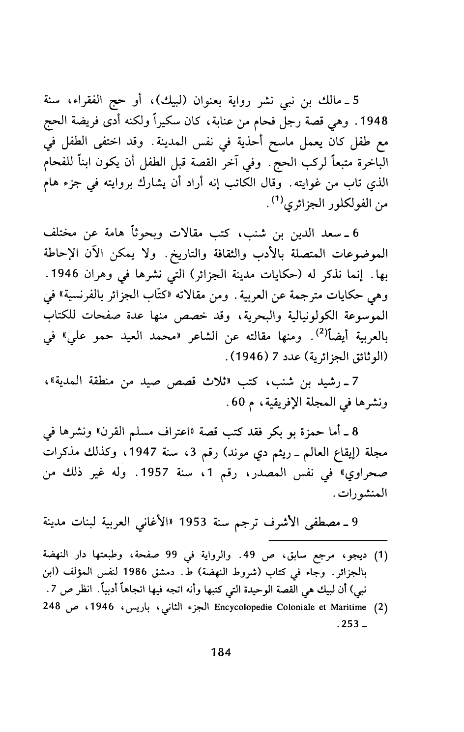 6 - سعد الدين بن شنب، كتب مقالات وبحوثا هامة عن مختلف الموضوعات المتصلة بالأدب والثقافة والتاريخ. ولا يمكن الآن الإحاطة بها. إنما نذكر له (حكايات مدينة الجزائر) التي نشرها في وهران 1946. وهي حكايات مترجمة عن العربية. ومن مقالاته (كتاب الجزائر بالفرنسية) في الموسوعة الكولونيالية والبحرية، وقد خصص منها عدة صفحات للكتاب بالعربية أيضا (¬2). ومنها مقالته عن الشاعر (محمد العيد حمو علي) في (الوثائق الجزائرية) عدد 7 (1946).